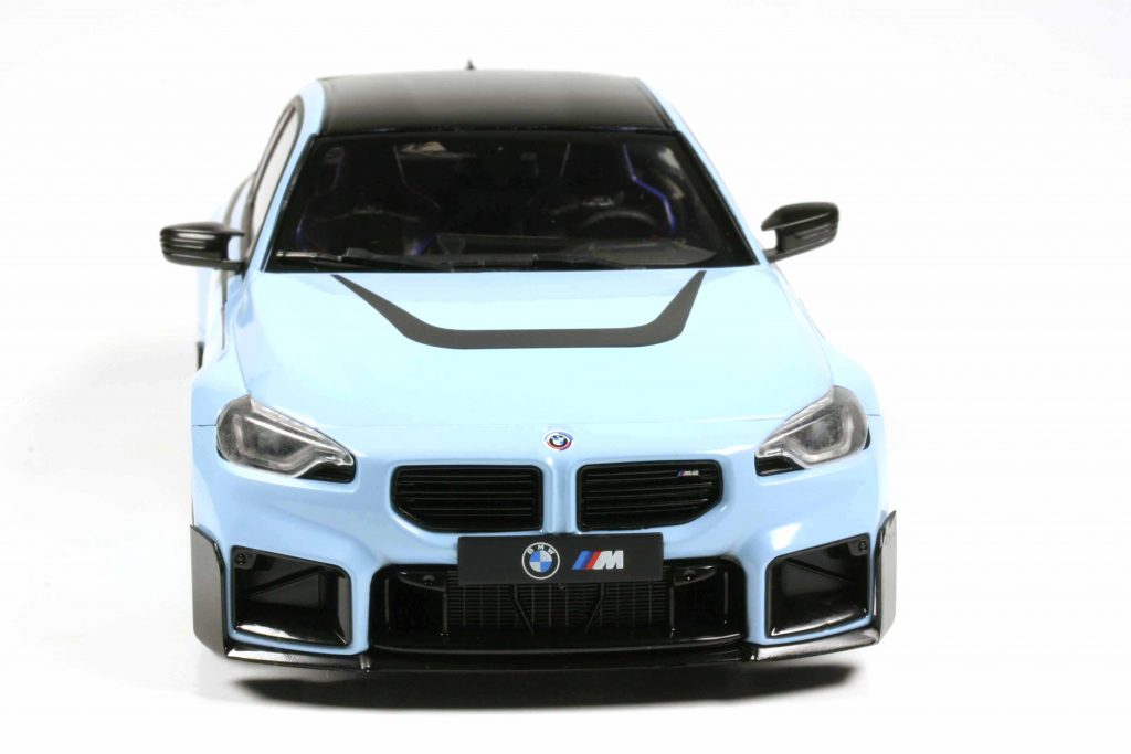 Dem Kleinen folgt der Große: Solido bringt seinen BMW M2 mit Performance-Teilen der aktuellen Generation G87 nun auch in 1:18, und zwar die Version nach dem 2024er Facelift, nunmehr mit Carbondach. Zunächst erscheint er in denselben Farben wie das Dreiundvierziger-Modell, nämlich Zandvoort Blau und Torontorot Metallic. Das sind seine originären Farben, die gibt es nur für ihn, die sind angesagt und attraktiv, von ihnen träumt der Facharbeiter. Letztlich ist der M2 ein M3/M4 mit der kleineren Karosserie des 2er Coupés, gleicher Motor, wenn auch ein paar Pferdchen weniger (460, seit Modelljahr 2025 sogar 480 PS), dafür auch wesentlich weniger Speck auf den Rippen und somit agiler. Für seine Fans ist der M2 der bessere M3/M4 und steht so richtig schön in der Tradition des seligen 2002 Turbo, während der M3 eher ein Familienauto ist (weil vier Türen) und der M4 ist unerreichbar. Wie beim M3/M4 setzt BMW auf den rahmenlosen Superbreit-Kühler mit horizontalen Rippen – ebenso umstritten wie heiß begehrt.