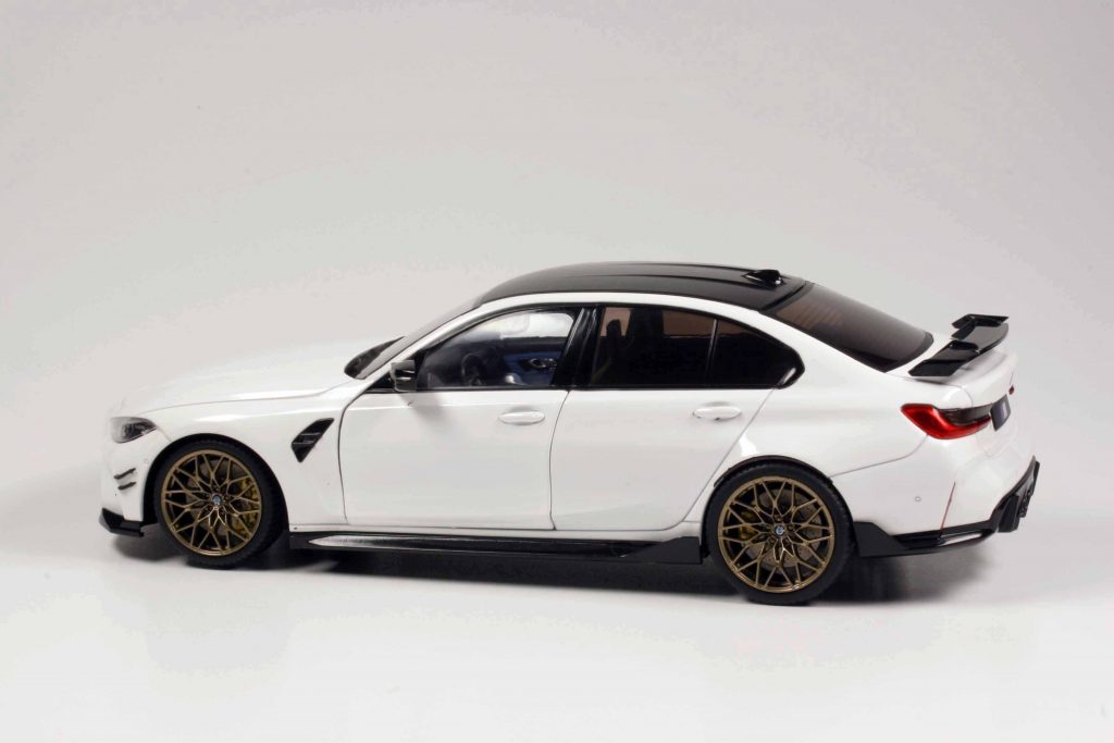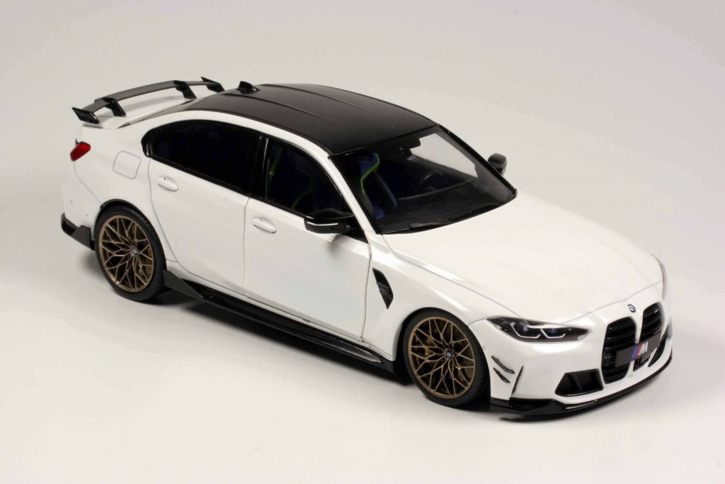 Beide gemeinsam zu besprechen, ist gar nicht schwierig, denn beide kommen aus demselben Hause und sind nach denselben Prämissen konstruiert – also identisches Handwerk und Layout, eben mit unterschiedlichen Vorbildern umgesetzt. Beide können die Türen aufmachen, lenken und rollen, beide haben ein unlackiertes und somit ziemlich plastikhaftes Interieur, beide sind sehr sauber in Weiß lackiert, die Anbauteile passgenau, die Drucke akkurat. Beide werden in immensen Stückzahlen auf den Markt geworfen, wodurch sie ziemlich preiswert sind, ohne billig zu wirken. Die Unterschiede liegen ganz deutlich in den Dimensionen, denn zwischen den Autos liegen gut 50 Jahre, in welchen sich die automobilen Dimensionen schwer veränderten – auch wenn sie die gleiche Klientel ansprechen und in der gleichen Fahrzeugklasse angesiedelt sind. Wenn der aktuelle und ohnehin leicht adipöse BMW M3 neben dem zierlichen und leicht gezeichneten 1971er Nissan steht, würde ein unbedarfter Betrachter sagen: „Diese beiden Modellautos sind nicht im selben Maßstab gehalten.“ Er hätte unrecht.