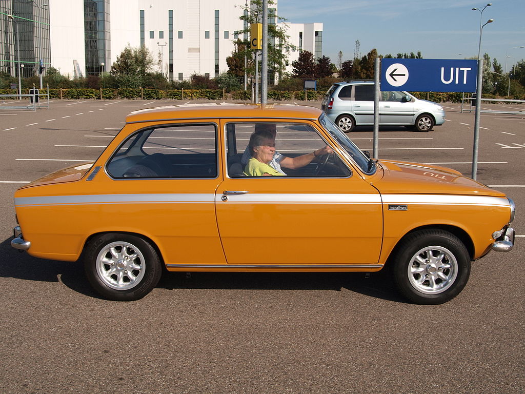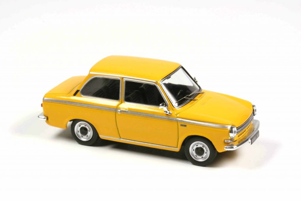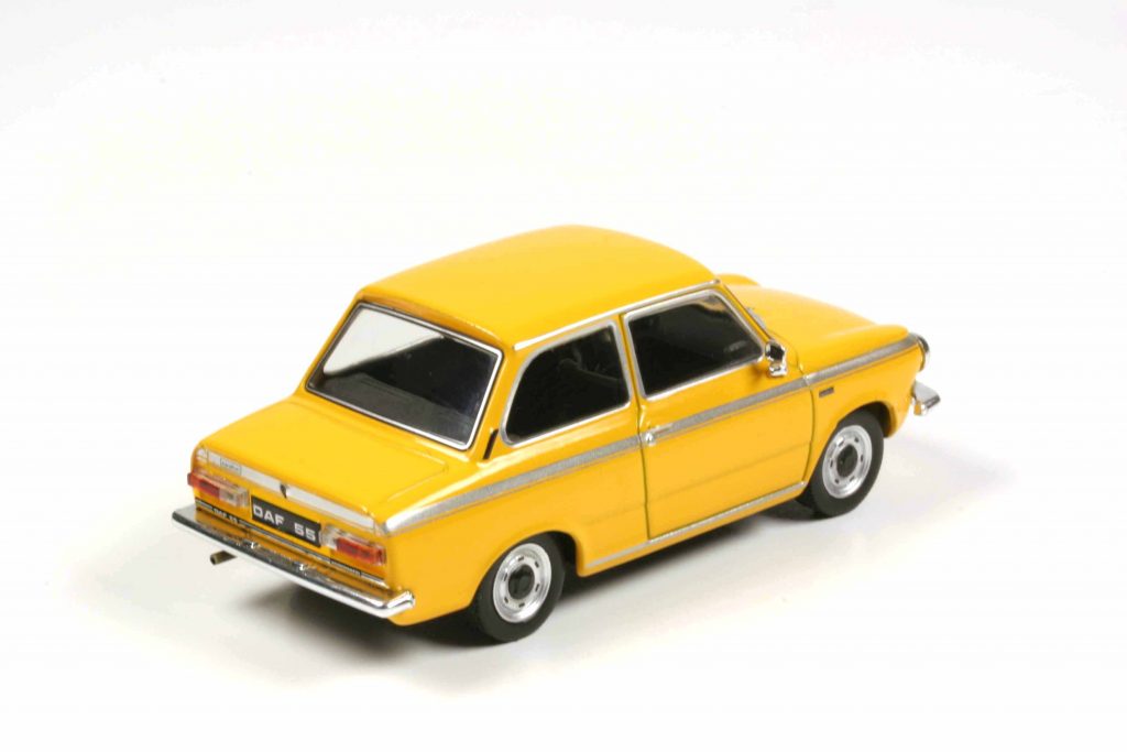 Wir haben den Daf stets ernst genommen, haben eine ansehnliche Daf-Abteilung in der Sammlung und freuen uns über jedes neue Exemplar. Nun ist es ein 55 Marathon in Mostana, mit dem uns Ixo delektiert. Mostana klingt nicht nur nach Mustard (englisch) oder Moutarde (französisch), sondern es ist auch Senfgelb. 9176 Daf 55 wurden 1971 und 1972 im niederländischen Born produziert, doppelter Marathon-Streifen seitlich (je nach Außenlack silbern oder schwarz), zentral platzierter Sportauspuff, 13-Zoll-Stahlfelgen mit schwarzen Radkappen, innen Teppichboden und Liegesitze, Lenkrad mit karierter Zielflagge auf der Nabe. Und dann natürlich 63 statt 50 PS und somit eine Höchstgeschwindigkeit von 145 km/h (natürlich auch rückwärts, haha!). Den 55 Marathon gab es neben Mostana noch in der Farbe Nationa, und das ist, der Gedanke bietet sich an, in Holland natürlich Orange als Nationalfarbe. Die dritte lieferbare Farbe heißt Kobina und ist schlichtes Weiß.