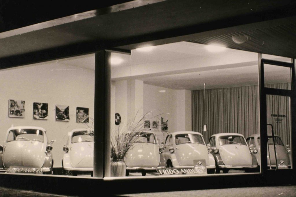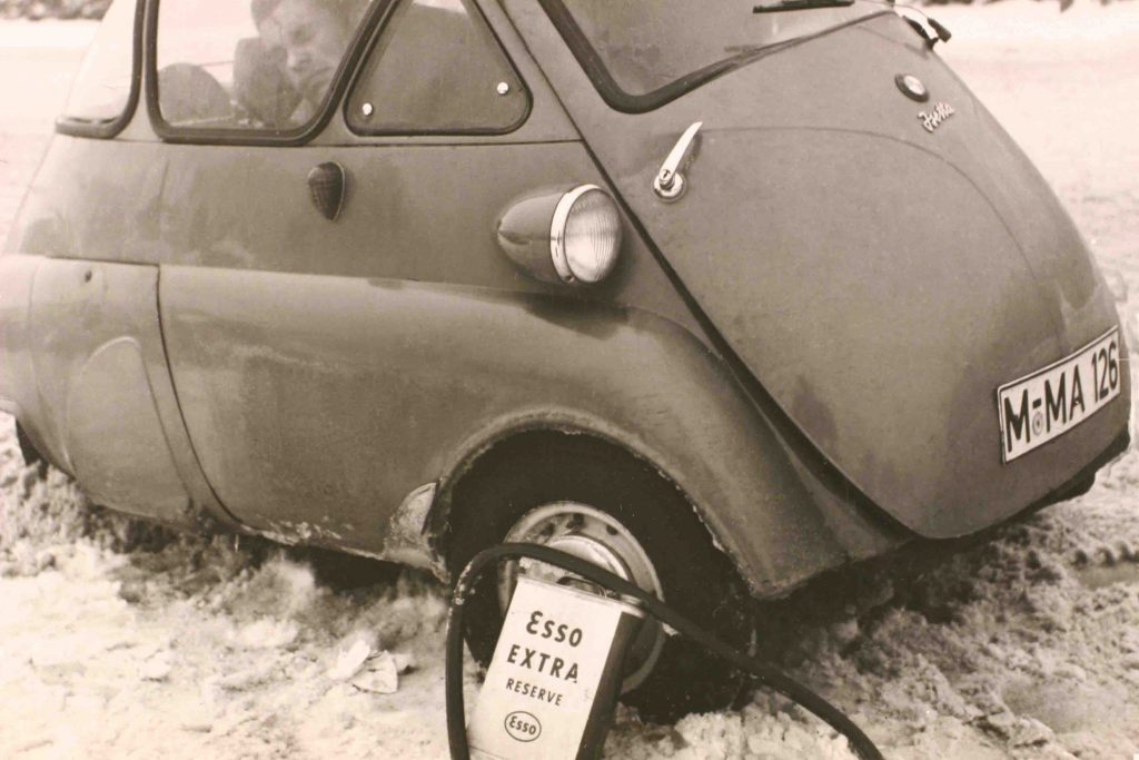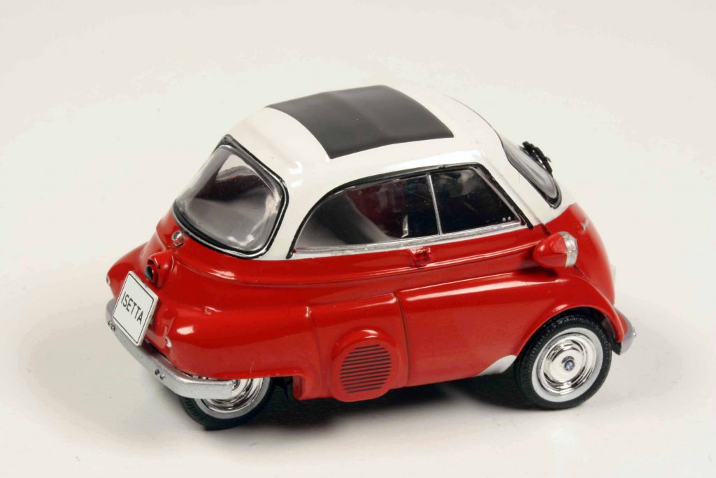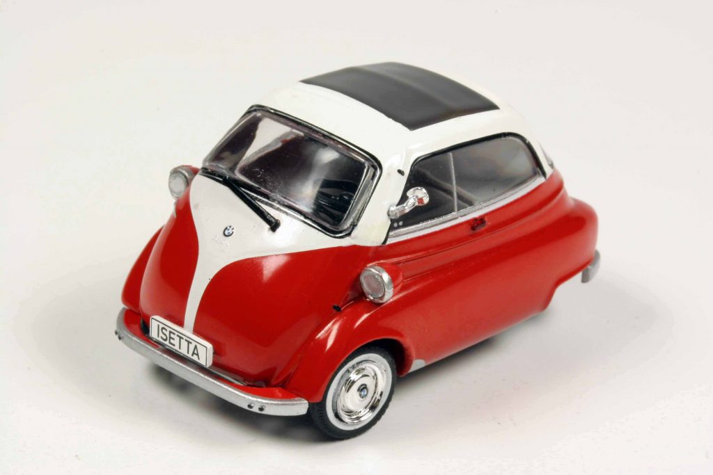 Nun kommt als reguläres Fachhandelsmodell eine zweifarbige und somit höchst attraktive BMW Isetta in der 1957er Exportversion. Die ursprüngliche BMW Isetta von 1955 war die eins-zu-eins-Lizenz der italienischen Iso Isetta, jedoch mit zwei BMW-Zweizylinder-Viertakt-Boxermotoren aus dem BMW-Motorrad (250 und 300 Kubik). Ab Oktober 1956 konnte der Kunde wählen. Die bisherige Isetta wurde zum Standard-Modell, darüber angesiedelt war die besser ausgestattete Export-Isetta mit neu gestalteten, durchgehenden Seitenscheiben, die sich sogar aufschieben ließen, dazu Vorderstoßstange über die gesamte Fahrzeugbreite und sanfter abgestimmtem Fahrwerk. Anfangs ein Erfolg, schwächelte die Isetta ab 1957 durch wachsende Konkurrenz (Goggomobil) und ebenso wachsenden Wohlstand der Deutschen. Das Exportmodell wurde bis Frühjahr 1962 gebaut, vor allem für die Inhaber des alten Führerscheins der Klasse IV. Spitznamen hatte die Isetta viele, und der netteste davon dürfte wohl „Knutschkugel“ gewesen sein. „Stopfei“ klingt hingegen eher despektierlich. Die letzten Jahre erfolgte keinerlei Modellpflege.