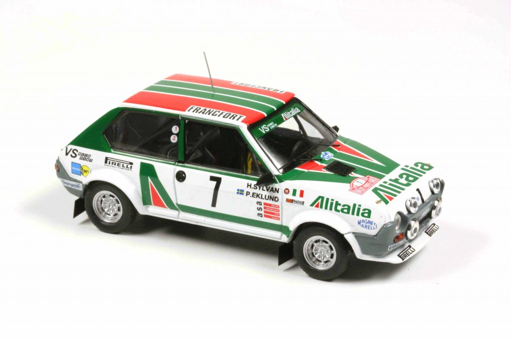 Der Ritmo hat in Italien denselben Stellenwert wie bei uns der Golf, obendrein sind die Italiener nicht nur autoverrückt, sondern eine modellautobegeisterte Nation. Und Alitalia kleidet sich in den italienischen Nationalfarben. Das passt also gut zusammen. Ein Monte-Carlo-Ritmo in Farben, die italienischer kaum sein könnten: Alitalia ist der Sponsor, und Ixo schaffte eine perfekte Weiß/Grün/Rot-Lackierung unter Zuhilfenahme allen Dekorationskönnens mit Decals. Auch sonst: Formal prima getroffener Ritmo mit fetten Kotflügelverbreiterungen, vorne eine Leuchtenbatterie, sowohl von Abarth als auch von Ixo aufwendig in die Karosserie hineinmodelliert, schöne Haubenschnellverschlüsse und sonstige Rallyeattribute außen. Und natürlich innen. Schalensitze, fetter Käfig, Reserverad statt Rücksitzbank, knallrote Hosenträgergurte, das Armaturenbrett dem Zweck angepasst, auf dem Dach die Funkantenne. Super gemacht auch die fein ziselierten FPS-Alufelgen.