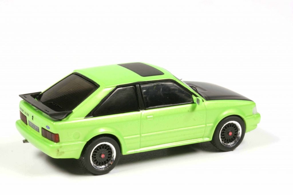 Ixo teilt die Zählweise der englischen Ford-Filiale und spricht vom Escort Mk IV. In Kontinentaleuropa zählt man anders und spricht vom Escort III Facelift oder, noch eindeutiger, vom Escort ’86. Ihn bringt Ixo als heißen XR3i in giftigem Hellgrünmetallic mit mattschwarzer Haube und schönen Alus im BBS-Stil, mattschwarze Speichen und polierter Felgenrand, ohne Zusatzscheinwerfer, Stoßfänger und Spiegelgehäuse ganz korrekt in Wagenfarbe, auf dem Dach ein mattschwarzes Schiebedach, abgedunkelte Heckleuchten, insgesamt kein Gramm Chrom und hinten ein Spoiler. Absoluter Hot Hatch, die Freude eines jeden Boy Racers.