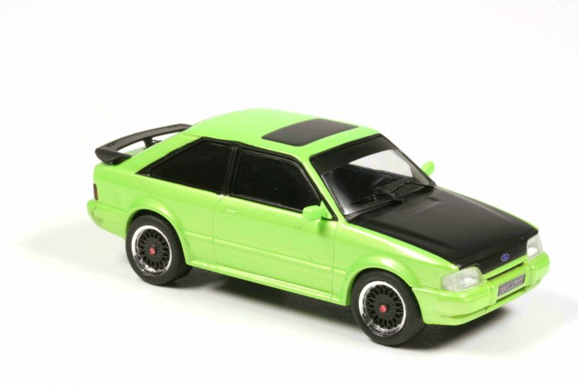 Ixo teilt die Zählweise der englischen Ford-Filiale und spricht vom Escort Mk IV. In Kontinentaleuropa zählt man anders und spricht vom Escort III Facelift oder, noch eindeutiger, vom Escort ’86. Ihn bringt Ixo als heißen XR3i in giftigem Hellgrünmetallic mit mattschwarzer Haube und schönen Alus im BBS-Stil, mattschwarze Speichen und polierter Felgenrand, ohne Zusatzscheinwerfer, Stoßfänger und Spiegelgehäuse ganz korrekt in Wagenfarbe, auf dem Dach ein mattschwarzes Schiebedach, abgedunkelte Heckleuchten, insgesamt kein Gramm Chrom und hinten ein Spoiler. Absoluter Hot Hatch, die Freude eines jeden Boy Racers.