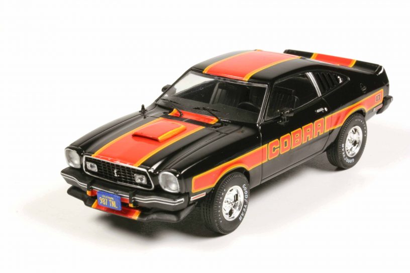 Träne hin oder her, alt ist er geworden, und das setzt die Szene mit erhaltenswert und wertvoll gleich. Der Mustang II hat seine Freunde – und wenn es nur die alt Gewordenen sind, die ihn seinerzeit als Neu- oder Gebrauchtwagen fuhren. Außer Tomica-Dandy in Japan setzte sich kein Miniaturautohersteller zeitgenössisch mit ihm auseinander, aber das Tomica-Modell war und ist sehr gut. Nun kommt Ixo mit einem Fastback-Mustang-II mit Cobra-Paket, und das ist durchaus eine willkommene Angelegenheit. Der Wagen ist tiefschwarz lackiert, trägt Front- und Heckspoiler, dazu eine mächtige (Fake-) Lufthutze auf der Haube, Lüftungsschlitze statt hinterer Seitenscheiben und stylische Vollchromfelgen im Wolfrace-Look. Und dazu das Cobra-II-Outfit, und das hat es in sich, vor allem kombiniert mit Schwarz innen und außen: Breite rote Streifen, eingerahmt von schmalen orangefarbenen Streifen, sowohl über Motorhaube, Dach und Heckklappe als auch an den Flanken, dort mit riesigem „Cobra“-Schriftzug versehen. Das macht was her und symbolisiert das ganze Wesen des Autos: mehr scheinen als sein.