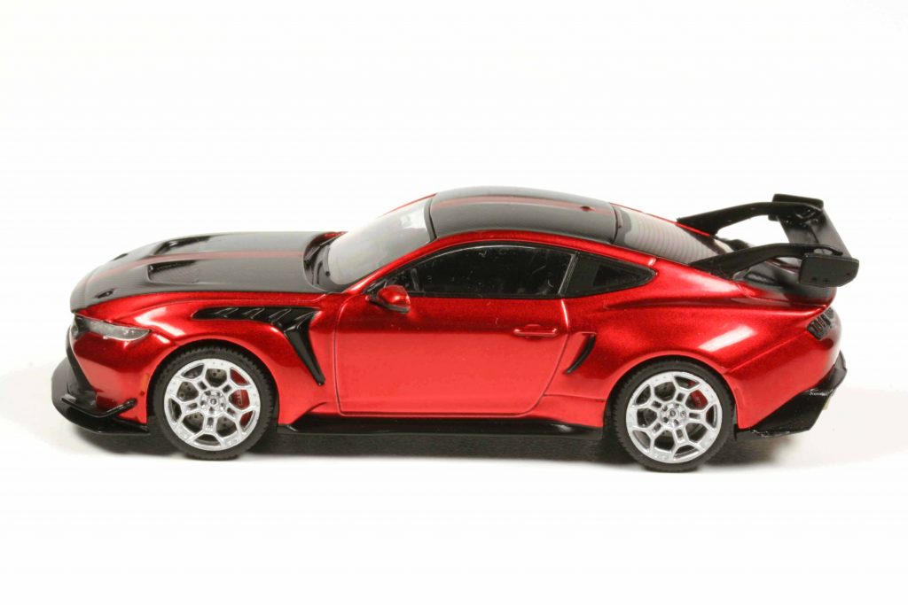 In 1:43 ist Ixo der Erste in Sachen GTD. In 1:18 die üblichen Verdächtigen, GT Spirit natürlich, MCG und Maisto haben ihn angekündigt, Ixo will ihn ebenfalls in 1:18 bringen. Und wenn die 7500 Originale längst verkauft sind (sind sie angeblich bereits) und das Auto nur noch ein Gebrauchter ist, also in ein paar Jahren, könnte sein, dass sogar AUTOart einen GTD bringen wird. Nun also Ixo, eine wahrhaft prächtige Miniatur. Und ein eigens für das Fachhandelsprogramm konstruiertes Modellauto, keine modifizierte Kioskminiatur, also auf hohem Ixo-Standard, vergleichbar mit 43ern von Norev oder Maxichamps (und letzteren in der Innenraumgestaltung haushoch überlegen). Ixo startet den GTD in zwei Farben, Anthrazitmetallic (Polymimetic Grey) für die Seriöslinge und Tuningrotmetallic (Croma Flame) für die Exaltierten, prinzipiell identisch, aber unterschiedlich dekoriert. Der Graue trägt ein glanzschwarz lackiertes Dach, beim Roten ist es, ebenso wie die Motorhaube, semi-carbonisiert, also eine Art Weissach-Paket für den Mustang GTD, wobei Ixo das Carbon nicht als Druckwerk oder Decal anbringt, sondern leicht strukturiert, was man einfach nachvollziehen kann, wenn man mit dem Fingernagel darüber streicht. Die Modelle sind klasse gemacht, geben die Wildheit des Ponys grandios wieder, breit, aggressiv, massig – da hat Ixo ganze Arbeit geleistet. Allerdings sprechen wir hier auch nicht von der 24,95-Preisklasse. Ixo verlangt dafür 37,95 Euro. Das entspricht Norev und Maxichamps, preislich gleiche Liga. Und doch eine andere: Norev macht kaum mehr neue 43er, so wenig wie Minichamps. Was dort erscheint, ist neuer Wein aus alten Schläuchen. Ixo hingegen investiert in neue Formen.