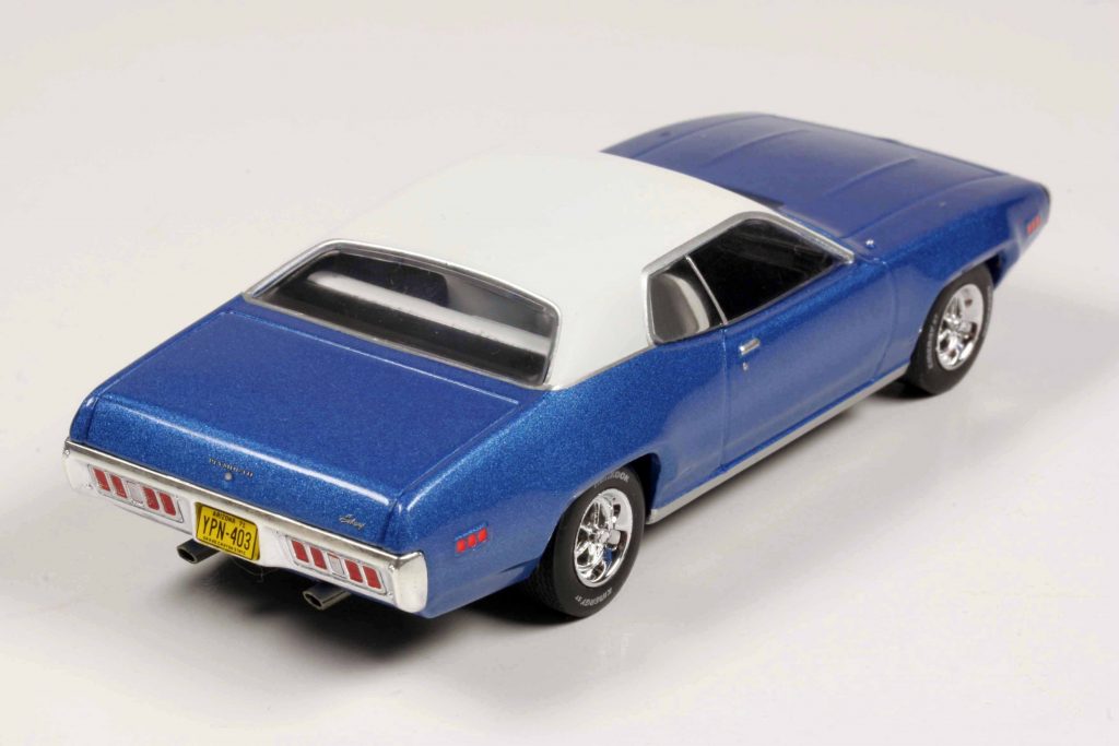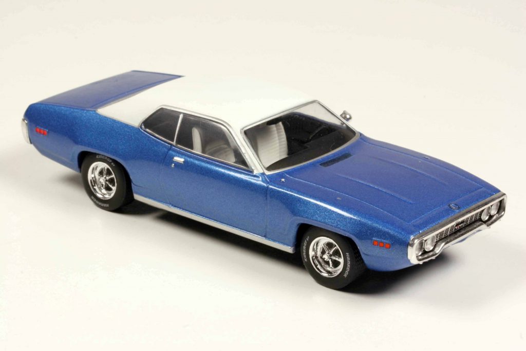 Aus einer Ausstattungsvariante des Plymouth Belvedere wurde 1968 die eigenständige Baureihe Satellite, und der legendäre Road Runner („Meep Meep!“) basierte darauf, was dem Satellite einen hochmotiviert-sportlichen Touch verlieh, die Optik an den Charger angelehnt. 1971 erschien der Satellite dann mit komplett neuer Karosserie im Fuselage-Styling, alles rundlich und dicklich, keine Ecken und Kanten mehr. Interessantes Detail: Der Kombi teilte sich zwar die Front der Viertürer-Limousine, aber das Coupé war ein völlig eigenständiges Design, kein Blechteil war identisch zum Viertürer. Das Coupé, die Ixo-Karosserievariante, gab es in drei aufsteigenden Ausstattungen namens Satellite, Satellite Pro und Satellite Plus (und zusätzlich natürlich GTX und Road Runner), Ixo macht das Topmodell – leider mit geschlossenen Seitenscheiben, denn bei einem Coupé ohne Mittelpfosten („Hardtop-Bauweise“) sieht es natürlich immer gut aus, wenn die Seitenscheiben B-säulenfrei herabgelassen sind. Das spezifische Designmerkmal der Coupés zwischen 1971 und 1973 ist die vordere Stoßstange, geformt wie ein Geschenkband oder eine Schleife. Der Satellite Plus wird mit der stärksten Motorisierung verbunden, 7,2-Liter-V8 Mopar Big Block, kombiniert mit einer kräftefressenden Dreistufenautomatik.