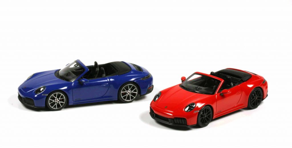 Minichamps 64130 Porsche 911 Carrera GTS (Typ 992/II) Cabriolet 2025 rot und 64131 dito dunkelblaumetallic. Fertigmodelle Zinkdruckguss, Maßstab 1:43. Auflage je 336 Exemplare. Preis je 59,95 Euro.