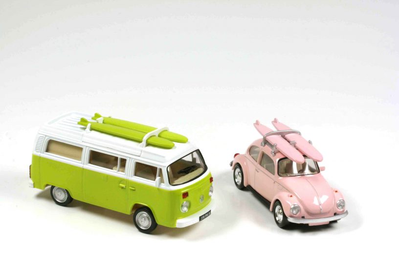 Zwar nur Farbvarianten, aber äußerst attraktiv: Norev bringt zwei Volkswagen der Heckmotor-Ära in seiner preiswerten Jet-Car-Serie erneut. Und während der VW T2b Bulli schon immer Surfbrett-Träger war, darf der Käfer 1303 erstmals welche transportieren.