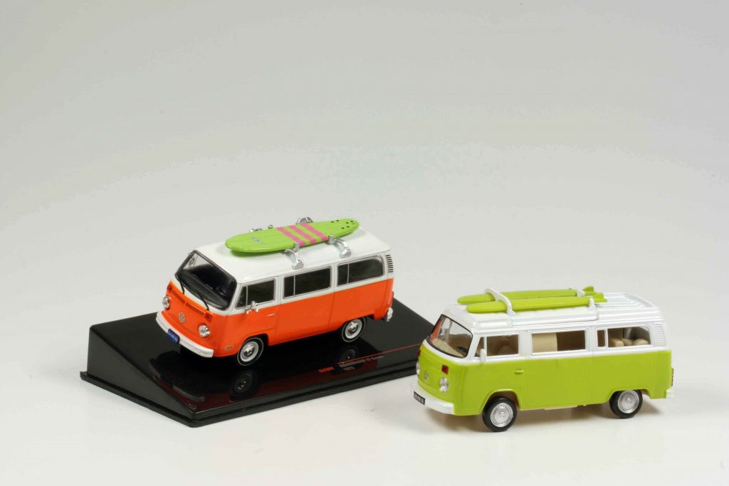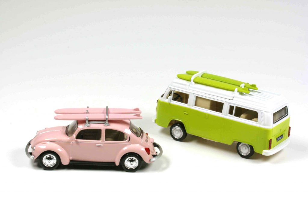 Norev Jet-Car 841004 Volkswagen 1303 1972 rosa mit Surfbrettern und 841107 Volkswagen T2b Campingbus 1976 hellgelbgrün/weiß mit Surfbrettern. Fertigmodelle Zinkdruckguss, Maßstab 1:43. UVP je 10,95 Euro.
