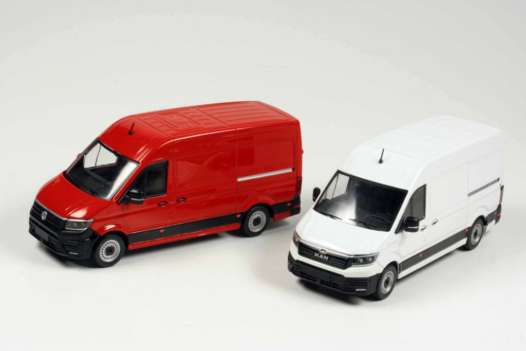 Es sind aber nicht nur Ixo-Bestandsmodelle, die unter Odeon in neuen Farben und Versionen vermarktet werden, sondern auch Formneuheiten. Ganz neu ist das Großraumtransporter-Duo MAN TGE und Volkswagen Crafter, die aktuelle Generation Typ SY/SZ, seit April 2017 im polnischen Września gebaut. Baugleich zum Crafter ist der MAN TGE, reines Badge-Engineering: Tatsächlich sind die Badges, also die Schriftzüge, anders, leicht variierter Kühlergrill, MAN- statt VW-Zeichen auf der Lenkradabdeckung. Der Grund für die friedliche Koexistenz beider Konzernschwestern im selben Segment dürfte sein, dass Speditionskunden, die einen Transporter benötigen, gerne ihrem MAN-Händler treu bleiben, denn der MAN wird bei MAN gewartet. Die Volkswagen-Kundschaft wiederum schätzt das engmaschige VW-Vertriebs- und Servicenetz. Eine VW-Werkstatt findet man häufiger als einen MAN-Service.