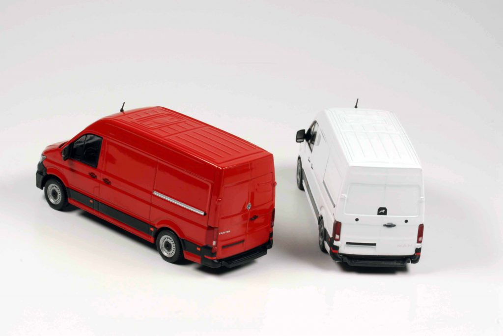 Viel Faszination geht von einem Großraumtransporter nicht aus. Aber er gehrt einfach dazu. Im Straßenbild ist er präsent, und in der Vitrine sollte er auch vorhanden sein. Der VW Crafter und sein eineiiger Zwilling MAN TGE gehören nach dem Mercedes Sprinter zu den meist verbreiteten „Sprintern“ – was mittlerweile zum Genrebegriff geworden ist.