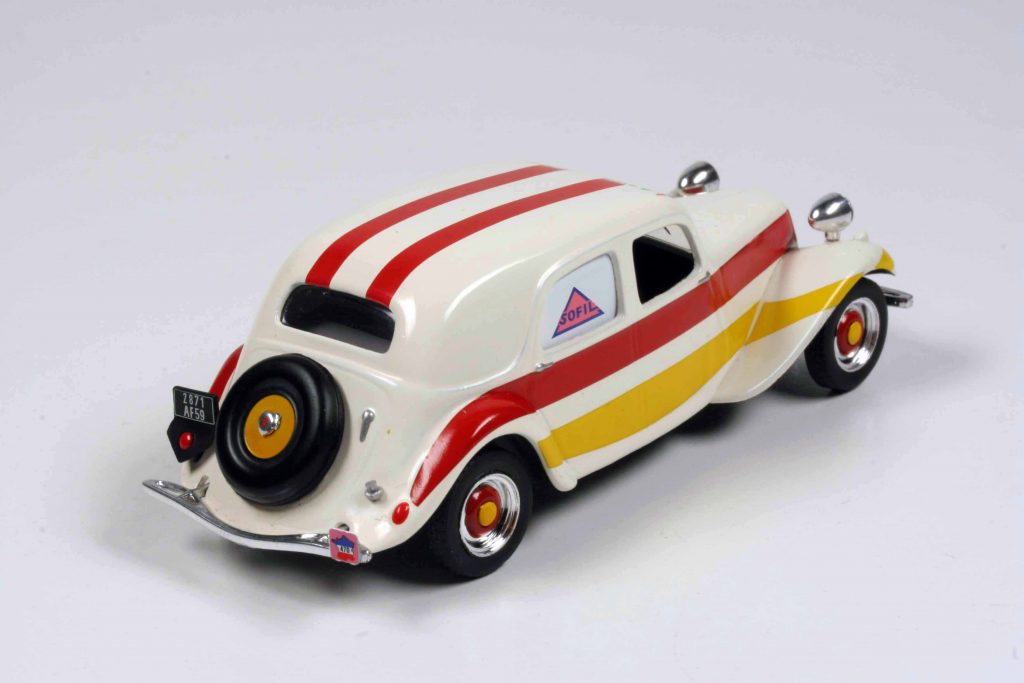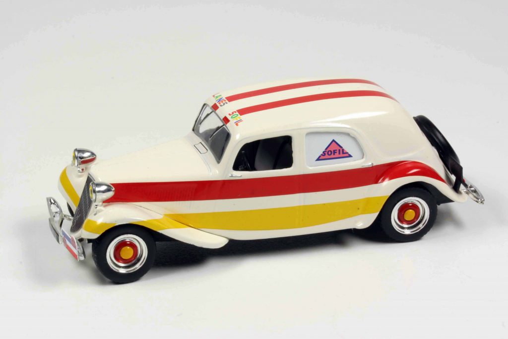 Schön bunt ist der Citroën 11CV Traction Avant, also die „Gangster-Limousine“, als Tour-de-France-Werbefahrzeug von Sofil. Das war eine Marke der französischen Weberei Jules De Surmont & Fils aus Tourcoing, ganz im Norden Frankreichs an der Grenze zu Belgien und das Zentrum der Kammgarnspinnerei. Von 1948 bis Mitte der 50er Jahre war Sofil offizieller Sponsor der Tour de France. Jeder Etappensieger  bekam von Sofil das gelbe Trikot, der Tour-Gewinner erhielt 10.000 Francs. Auf der Tour de France präsentierte sich Sofil als „la marque des maillots révolutionnaires“, also „die Marke der revolutionären Trikots“. Dieses Engagement musste Sofil natürlich durch Präsenz bei der Caravane du Tour de France unterstreichen, dem riesigen Tross an Werbefahrzeugen, die damals die Tour begleiteten und mit Lautsprechern auf dem Dach die Zuschauer bei Laune hielt und über die Ereignisse unterrichtete. Der Citroën Traction Avant von Sofil trägt zwar keinen Lautsprecher auf dem Dach, ist aber sehr auffällig gestaltet: Das damals nur in Schwarz bekannte Fahrzeug war weiß lackiert und trug an den Flanken zwei breite Streifen, rot und gelb, sowie einen roten Doppelstreifen auf dem Dach. Bis hin zu den korrekten Kennzeichen und diversen Tour-de-France-Schildchen ist der Ixo-Citroën von Odeon bestens recherchiert und sehr geschmackvoll ausgeführt. Eine tolle Ergänzung zur seinerzeitigen Kioskserie mit Tour-de-France-Begleitfahrzeugen (La Caravane du Tour de France, 2004 bis 2006, Norev-Modelle) und zur Serie Véhicules Publicitaires, die sich generell französischen Werbefahrzeugen widmete (2015 bis 2019, Ixo-Modelle).