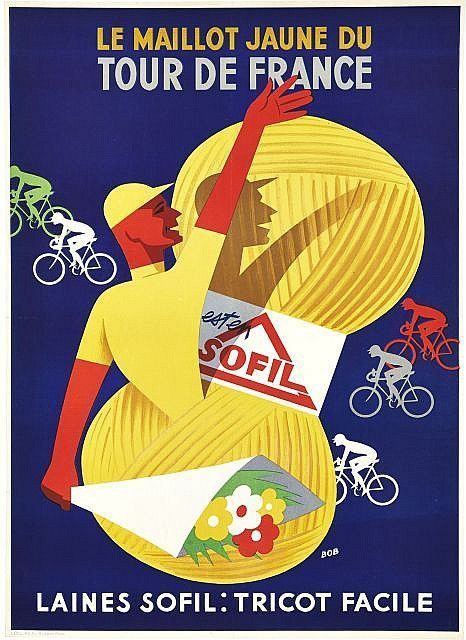 Sofil-Werbeplakat mit dem Radrenn-Thema aus den 50er Jahren: Das gelbe Trikot, es stammt von Sofil. Und der Traction Avant, er wirbt für Sofil.