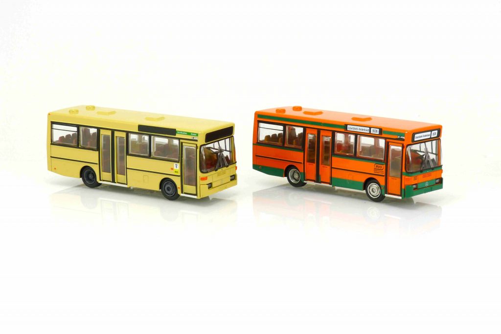 Brekina 52275 Mercedes O 402 „RVO“ 1985. Aufbau orange mit grünem Streifen. IA hellbraun. Linie „9538 Scharitzkehl-Vorderbrand“. 52277 dito „BVG“ sandgelb. IA rot. Jeweils beiliegende Seitenspiegel. UVP jeweils 28,95 €.