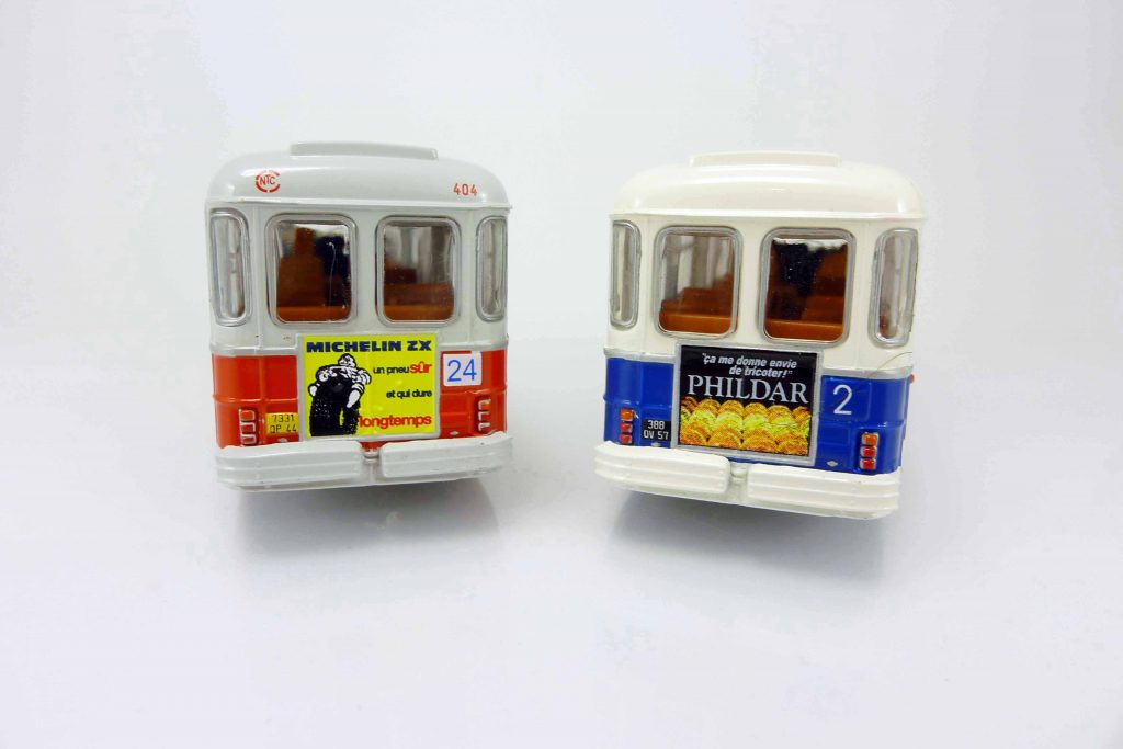 61403 Autobus Saviem SC 10 Metz „TCRM“ 1965. Aufbau weiß mit blauer Bauchbinde. IA braun. Linie „2 Place d‘Armes“. 61404 dito Nantes „CNTC“, hellgrau mit roter Bauchbinde. Linie „24 Champ de Mars“. Wagennummer 404. Jeweils beiliegende Seitenspiegel. UVP jeweils 34,95 €.