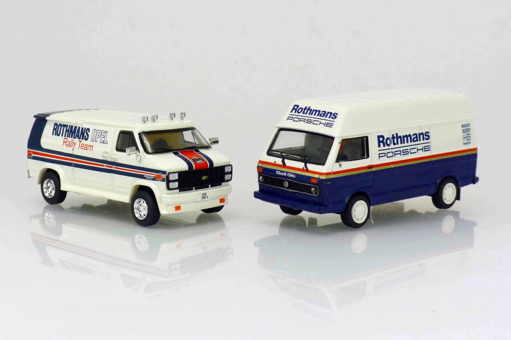 34953 VW LT Hochdach-Kastenwagen „Rothmans Porsche“ 1975. Karosserie oben weiß, unten ultramarinblau. IA schwarz. 18257 Chevrolet C20 Van „Rothmans Opel Rally Team“ 1983. Karosserie weiß, Heck ultramarinblau. UVP jeweils 21,95 €.