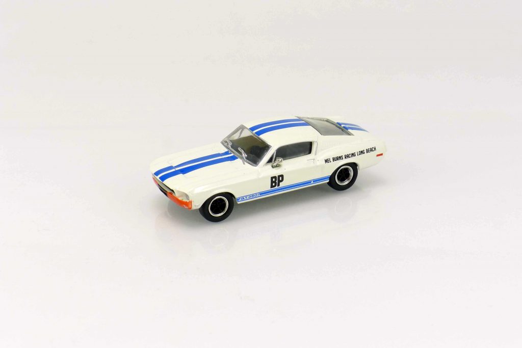 19613 Ford Mustang GT 350 Fastback „Mel Burns Racing“ 1966. Karosserie weiß mit blauen Längsstreifen. IA schwarz. UVP 19,95 €.