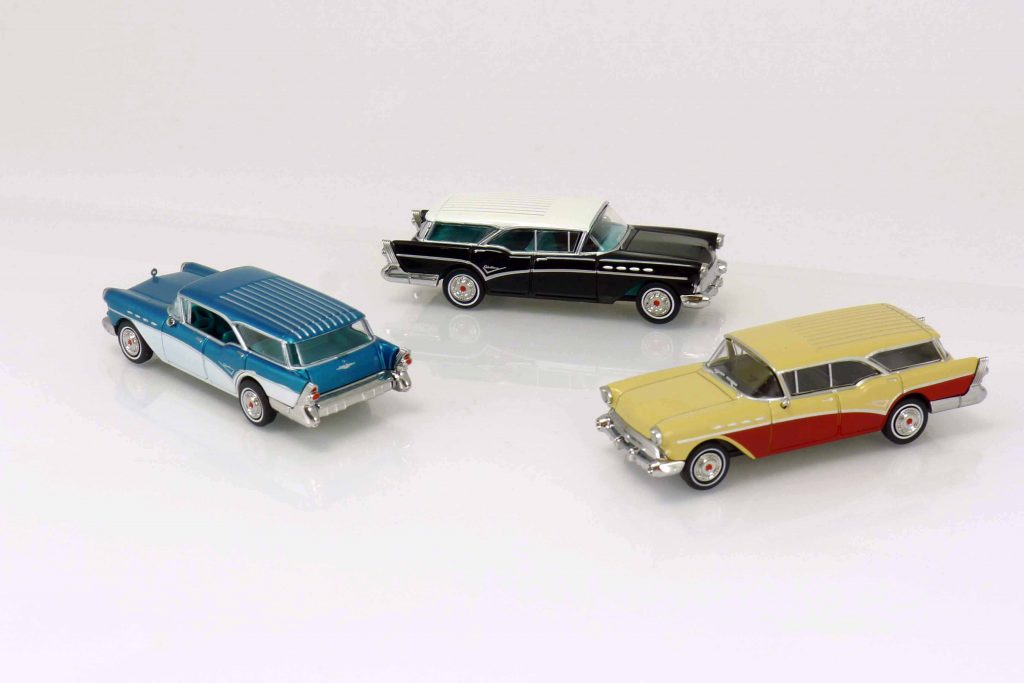 Buick, ebenfalls eine Marke des General Motors-Konzerns, lieferte im Modelljahr 1957 vier Modelle: Special, Super, Century und Roadmaster, wobei die angebotenen Karosserievarianten (zwei- und viertürige Limousine, Station Wagon oder Convertible) nicht bei allen Grundmodelle verfügbar waren. Brekina hat den Century Caballero, eine luxuriöse Kombiausstattung, ausgewählt, eine weise Entscheidung. Aufgrund der vier Portholes an den Vorderkotflügeln (die typischen Buick-Bullaugen!) lässt er sich als Fahrzeug mit 300 PS identifizieren. Da nur wenige Caballero produziert wurden (der Verkaufspreis war sehr hoch), sind diese frühen Lifestylekombis heute gesuchte Oldtimer.