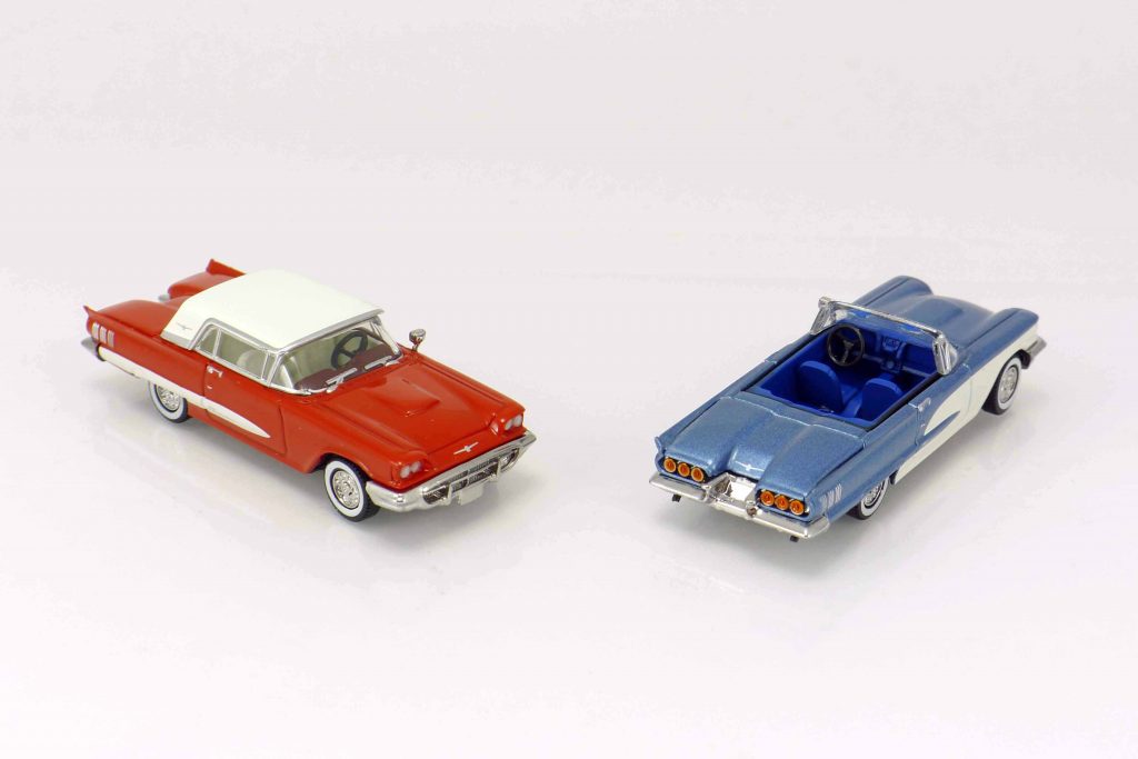 Brekina 18125 Cadillac Coupé DeVille 1972. Karosserie dunkelrotmetallic. IA und Verdeck hellbeige.18129 dito weiß. IA rot. Verdeck dunkelblau. UVP je 19,95 €. 18180 Buick Century Caballero 1957. Karosserie helltürkismetallic/weiß. IA türkis. 18176 dito beige/rot. IA schwarz. 18177 dito schwarz mit weißem Dach. IA türkis. UVP je 19,95 €. 18203 Ford Thunderbird Hardtop 1960.Karosserie rot, Dach weiß. IA weiß. 18204 dito Cabriolet. Karosserie blaumetallic /weiß. IA blau. UVP je 19,95 €.