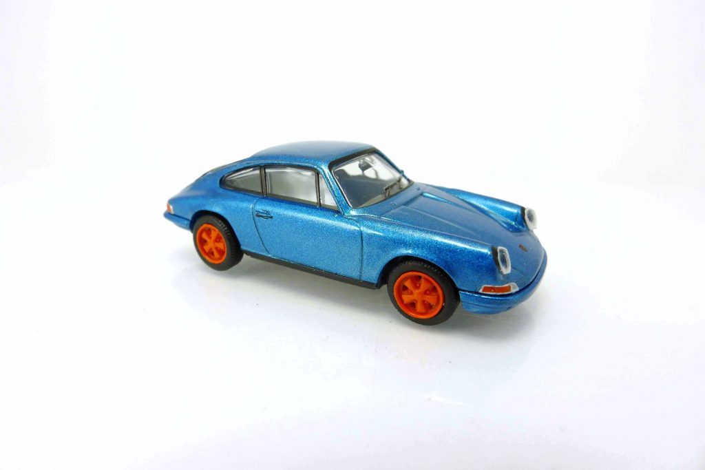Brekina liefert einen Porsche 911 als sogenanntes Restomod-Fahrzeug. Bei dieser neuen, natürlich aus den USA kommenden Mode geht es darum, einen Klassiker optisch und technisch zu modifizieren, ihn technisch sogar auf den neuesten Stand zu bringen, ohne seine Herkunft zu verleugnen. Das Brekina-Modell zeichnet die Restomod-Version in überzeugender Weise nach, wenngleich der Brekina-Elfer in seiner ganzen Machart nicht an einen Minichamps-Porsche herankommt. Gewagt, aber durchaus realistisch für das Genre, ist die Kombination der Karosseriefarbe in Blaumetallic mit knallorangefarbenen „Füchsen“, was ein wenig den legendären 911 Carrera RS 2.7 von 1973 zitiert.