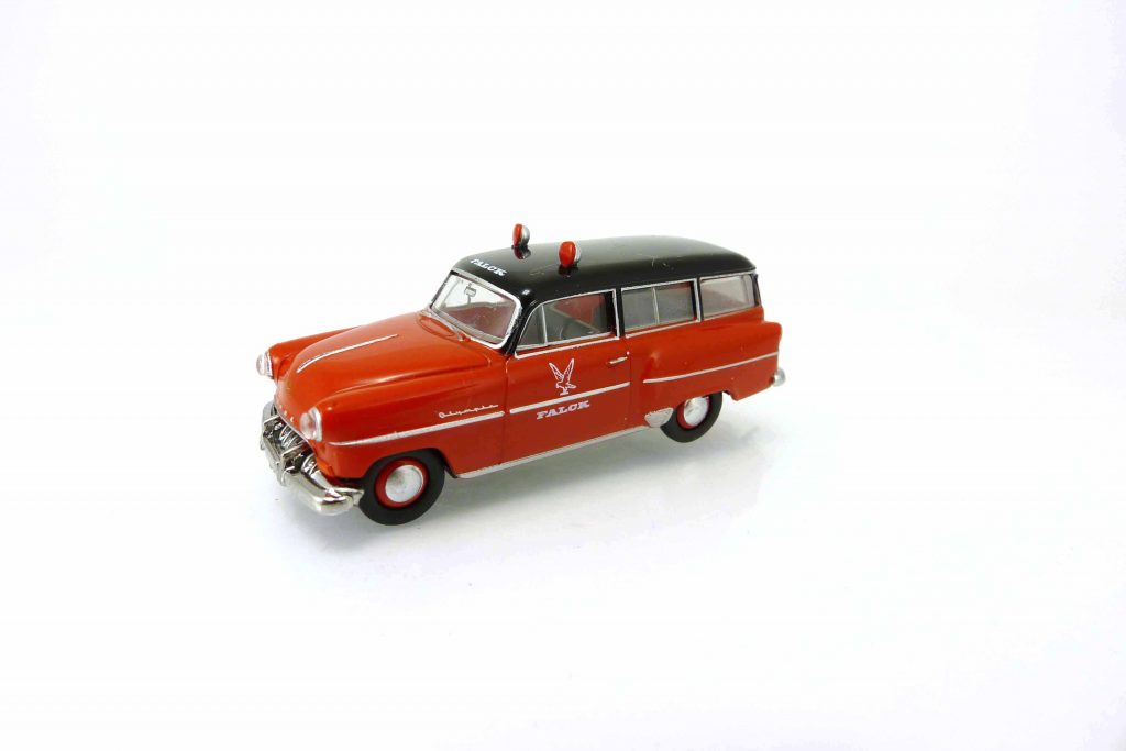 Fahrzeuge der dänischen Hilfsorganisation Falck wirken durch ihre rot-schwarze Lackierung immer besonders attraktiv, so auch der Opel Olympia Rekord Caravan des Baujahrs 1954. Die mattierten hinteren Scheiben lassen vermuten, dass Brekina hier einen Rettungswagen von Falck miniaturisiert hat.