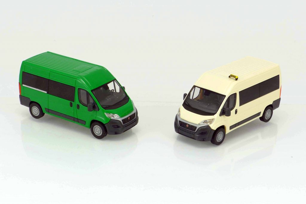 Busch 54651 Fiat Ducato Bus 2014. Karosserie grün. IA schwarz. UVP 26,99 €. 54655 dito Taxi, hellelfenbein mit Taxischild. UVP 28,99 €.