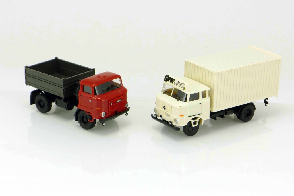 Espewe 95562 IFA L60 2SK Zweiseitenkipper. FH dunkelrot. Kipppritsche dunkelgrau, FG schwarz. UVP 36,99 €. 95308 IFA W50 L MK Lastwagen mit Möbelkoffer „Gipsy“. FH und Kofferaufbau weiß, FG schwarz. Beiliegende Seitenspiegel. UVP 39,49 €.