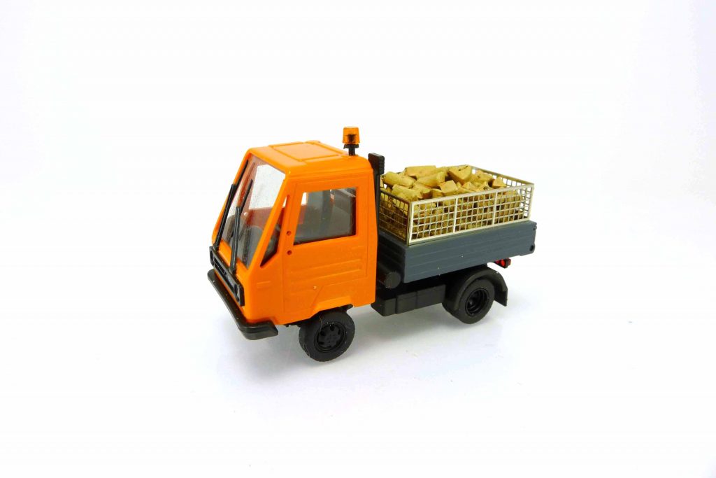42238 Multicar M26 Pritsche mit Gitteraufbau und Holzscheiten. FH kommunalorange. Pritsche grau. FG schwarz. Ein orangetransparentes Warnlicht. Gitter geätztes Metall. Beiliegende Seitenspiegel. UVP 25,99 €. 50422 Fortschritt ZT 320 A Kompaktor. Aufbau, FH, Räder und Räumschild orange. FH-Dach weiß. FG und Kühlergrill schwarz. Beiliegende Seitenspiegel. UVP 43,99 €.