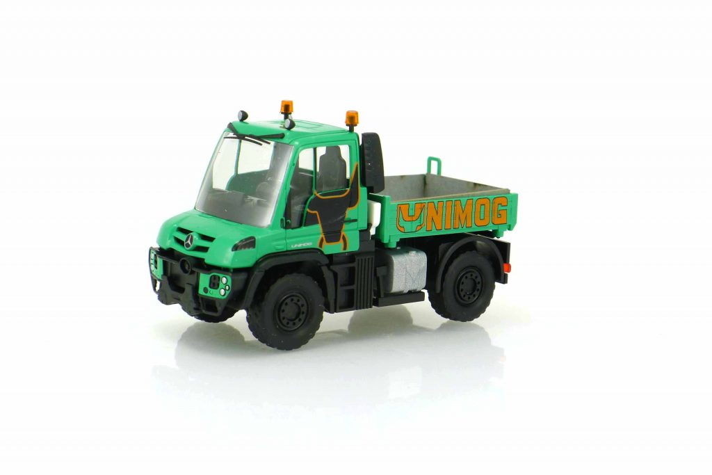 Der grüne Unimog U 430 erinnert in seiner Bedruckung an die ersten Unimog U 25 von 1949 mit dem legendären Ochsenkopf-Logo, entwickelt und zunächst gebaut von Böhringer. Ab 1950 übernahm Daimler-Benz die Produktion, behielt das Logo aber bis 1953, bevor es dem Mercedes-Stern weichen musste. Das Vorbild des Busch-Modells dient Daimler Trucks als Vorführ- und Ausstellungsfahrzeug.