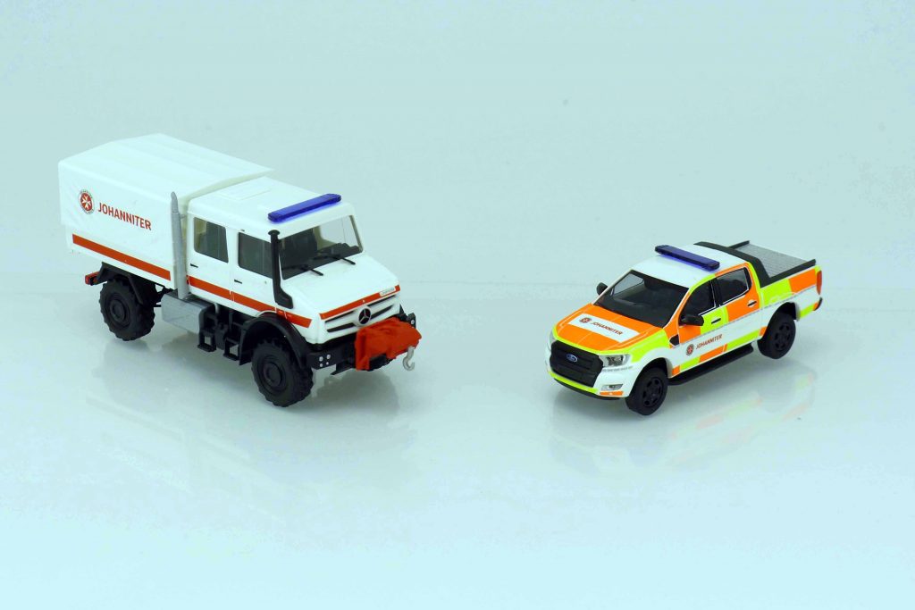 50935 Mercedes Unimog U 430 „Arbeitstier“. FH und Pritsche türkis. FG schwarz. Zwei orangetransparente Warnlichter. Beiliegende Seitenspiegel.  UVP 43,99 €. 51084 dito Unimog U 5023 Doppelkabine „Johanniter“. FH, Pritsche und Plane weiß. Seilwinde rot. Blautransparenter Dachbalken. UVP 49,99 €. 52848 Ford Ranger Gerätewagen „Johanniter Würzburg“. Karosserie weiß mit leuchtrot-neongelbem Battenberg-Design. IA schwarz. Blautransparenter Dachbalken. UVP 35,99 €. 51159 Mercedes Vito „Polizei/Gendamerie“. Karosserie weiß mit blauen und neongelben Streifen. Dachbalken mit blautransparenten Warnleuchten. Ein Einzelblaulicht. UVP 35,99 €. 52224 Mercedes-Benz VF 123 Krankenwagen (Miesen) „Croce Bianca Milano“. Karosserie blau mit weißem Dach und Seitenstreifen. IA schwarz. Zwei blautransparente Warnleuchten. UVP 36,99 €.