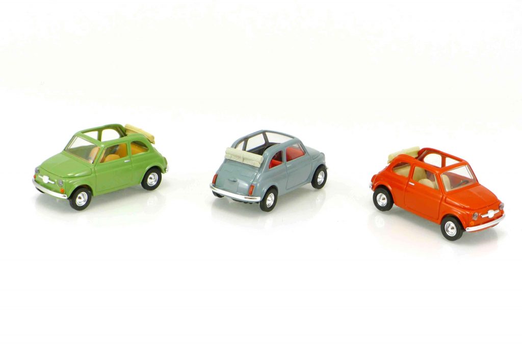Busch 48780 Fiat 500 Trasformabile 1965. Karosserie grau. IA rot. 48781 dito resedagrün. IA beige. 48782 dito rot. UVP je 17,90 €