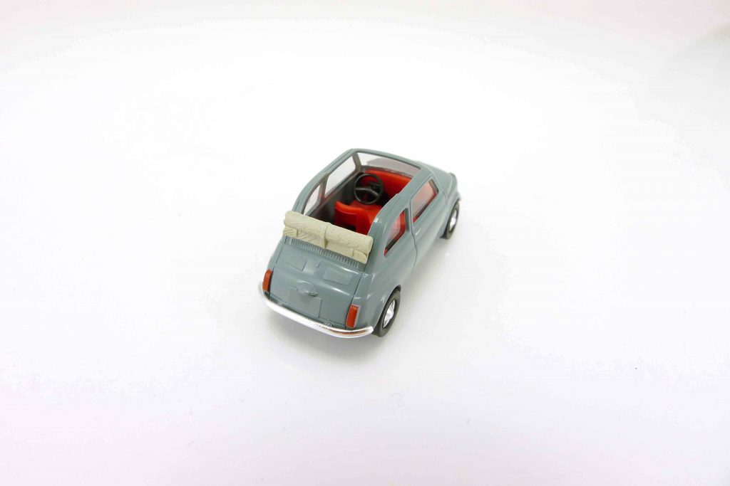Der ebenso kleine wie legendäre Fiat 500 N (Nuovo) war nicht nur ein sehr erfolgreiches Fahrzeug (über alle Karosserievarianten hinweg wurden von 1957 bis 1977 insgesamt 3.702.078 Exemplare gebaut), er ist auch zum Kultobjekt geworden. Den Zusatz „Nuovo“ erhielt er zur Abgrenzung vom Fiat 500 C Topolino, dessen Nachfolge 1955 der Fiat 600 antrat. Vom 600er übernahm der nuovo 500 die Formensprache, allerdings ein bisschen kleiner. Erst mit einem stärkeren Motor (15 PS statt anfangs deren 13) und einen gegenüber dem Fiat 600 reduzierten Preis stellte sich ein Verkaufserfolg ein. Letztlich war der Fiat 600 in Italien das „Auto del Popolo“, nicht der 500er. Der war selbst kleinwüchsigen Italienern zu winzig. Im Jahr 1965 brachte Fiat den 500 F auf den Markt, nunmehr die Türscharniere vorne anstelle der hinten angeschlagenen „Selbstmördertüren“. Die Leistung stieg auf fulminante 18 PS. Busch hat sich diese Version für die Verkleinerung in den Maßstab 1:87 ausgesucht, als Fiat 500 Trasformabile mit Faltdach über die komplette Dachpartie, mithin als Cabriolimousine. Das offene Dach gewährt beim Modell einen Blick auf die vorbildgerecht spartanische Inneneinrichtung mit separat eingesetztem Lenkrad. An der Front finden wir eingesetzte, transparente Scheinwerfer, Blinker und Rücklichter sind bedruckt. Leider hat sich Busch das Fiat-Logo auf der verchromten Frontschwinge gespart. Das zusammengerollte Verdeck baut ein wenig zu hoch, der Fahrer hat wenig Chancen auf Rücksicht. Aber die hat er ohnehin nicht, denn wir suchen vergebens einen Innen- oder Außenrückspiegel.