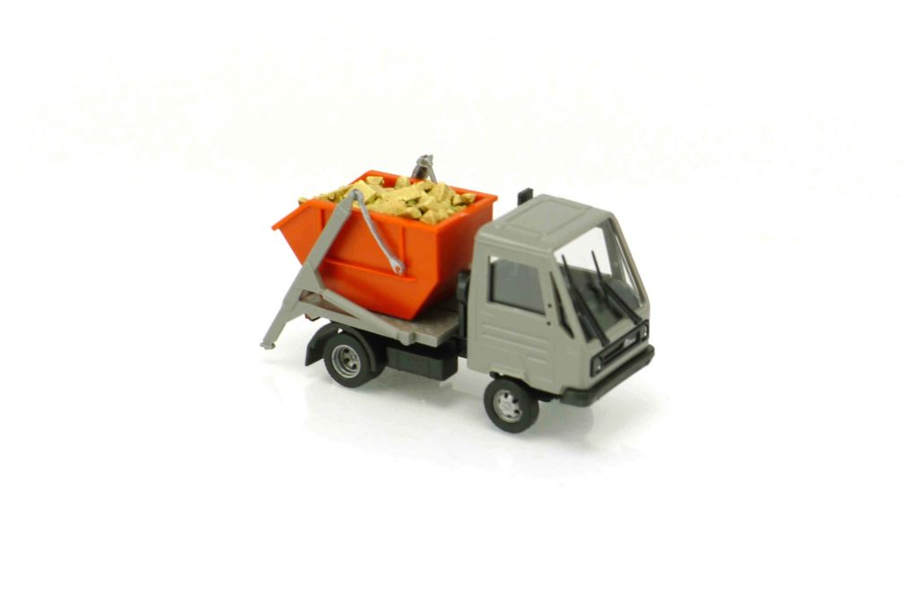 42237 Multicar M26 Absetzkipper mit großer Mulde. FH und Aufbau grau. Mulde rot. Holzladung. Beiliegende Seitenspiegel. UVP 23,99 €.