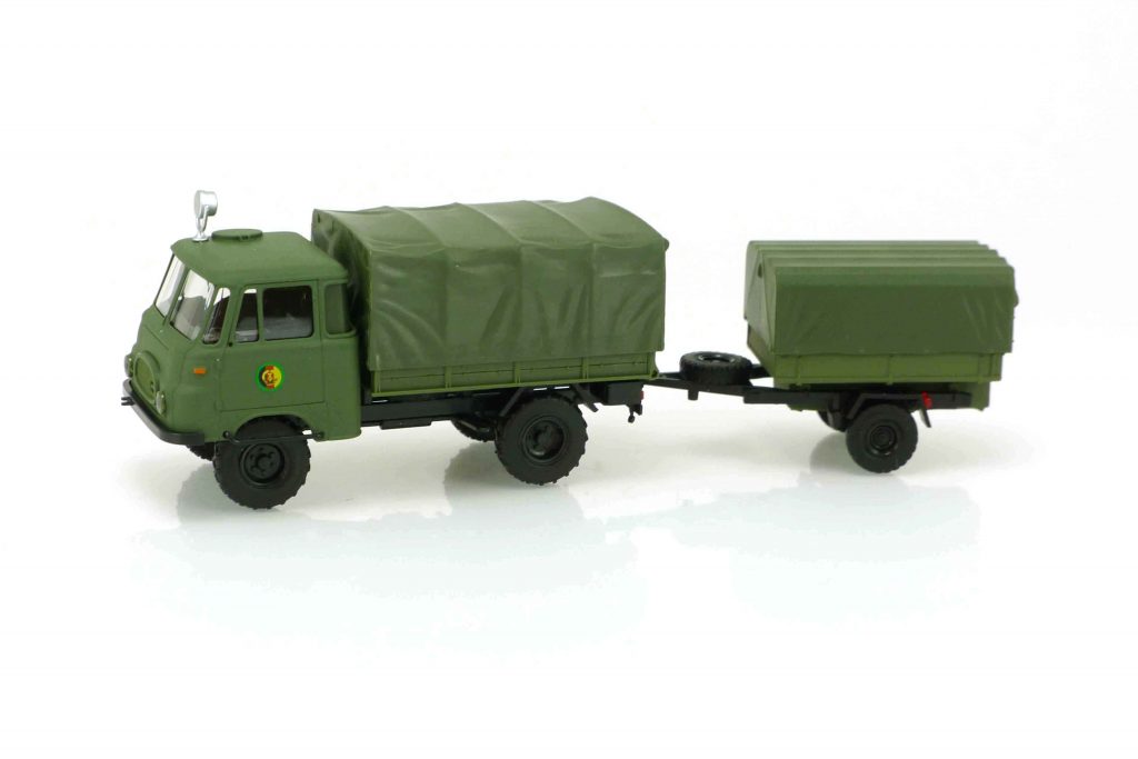 Die Grenztruppe, die zur Überwachung und Sicherung der Außengrenzen der DDR (land- und seeseitig) eingesetzt wurde, unterstand als eigenständige, bewaffnete Formation dem Ministerium für Nationale Verteidigung (MfNV). Als Mannschaftstransportwagen setzte die Grenztruppe auch Fahrzeuge der Bauart Robur LO 1800 A ein. Busch hat nun ein solches Fahrzeug in der typischen, mattoliven Farbgebung des Originals verkleinert. Vorbildgerecht zeigt sich das Wappen auf den Fahrerhaustüren (runde DDR-Fahne mit grünem Rand). Der Makel des Schießbefehls an der innerdeutschen Grenze wird allerdings der Grenztruppe für immer anhaften.