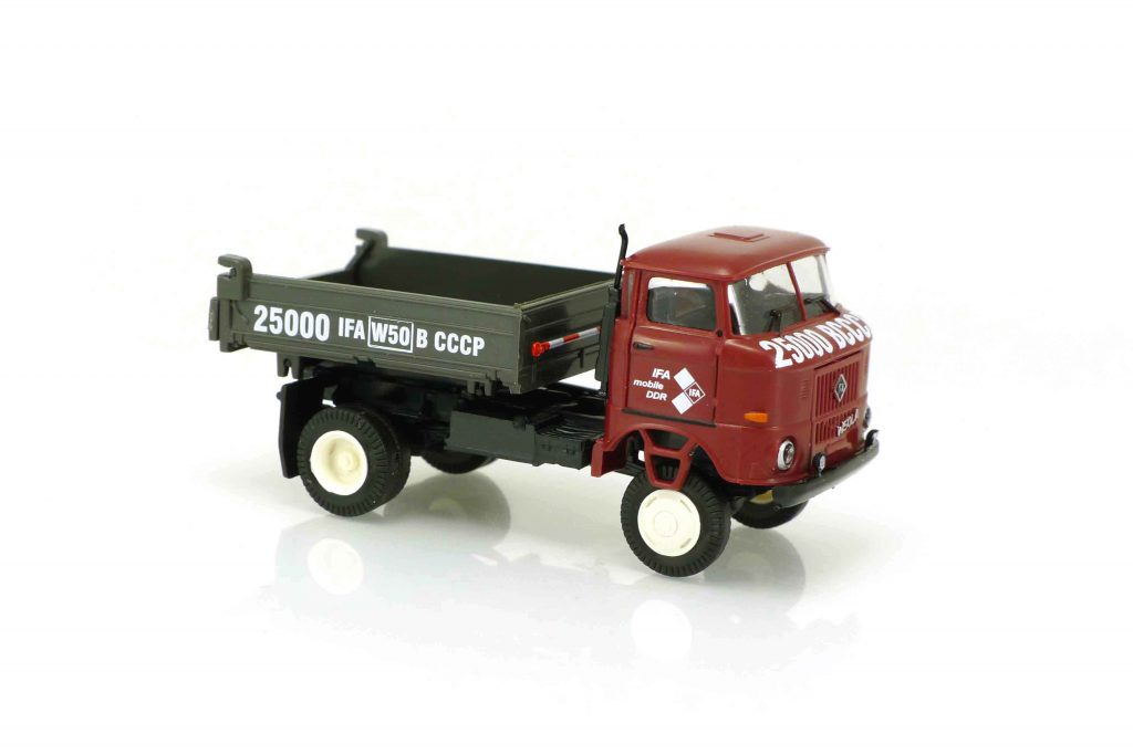 Der IFA W50 ist ein fester Bestandteil im Modellprogramm von Espewe. Im Original wurde er in über 70 Grundvarianten gebaut, die mit unterschiedlichen Aufbauten kombiniert werden konnten. Die am meisten produzierte Version stellte der IFA W50 mit Kippaufbau dar, der sich im Gelände bestens bewährte, besonders wenn er mit Niederdruckreifen ausgestattet war. Für die DDR war der von 1965 bis 1990 gebaute IFA W50 ein erfolgreiches Fahrzeug im Export, nicht nur in sozialistische Bruderstaaten, auch in andere Länder, die mit Devisen bezahlen mussten. Über 40 Staaten gehörten zu den Kunden, darunter auch die Sowjetunion. Espewe miniaturisiert den 25.000sten W50, der in die Sowjetunion (CCCP) exportiert wurde und aus diesem Anlass eine besondere Beschriftung erhielt.