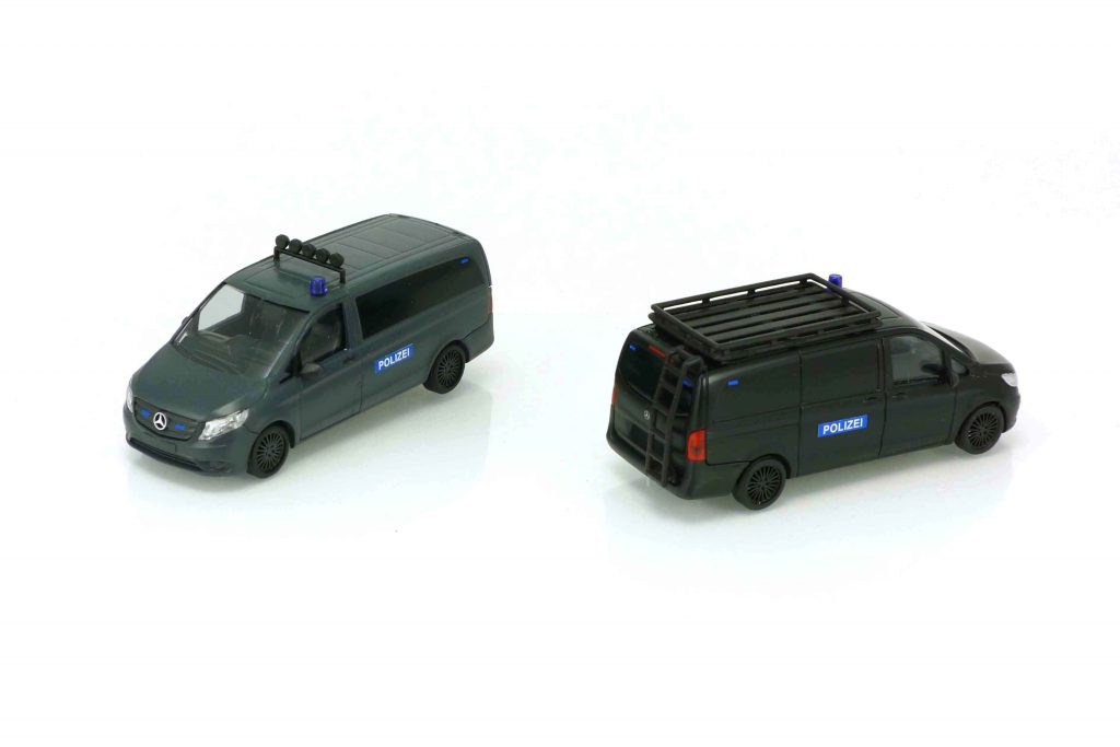 Busch 51100-199 Mercedes Vito Tourer SEK „Polizei“. Karosserie mattschwarz. Mit Dachgepäckträger und Heckleiter. Ein blautransparentes Warnlicht. 51100-200 dito mattgrau, mit Dachscheinwerfern. Auflage jeweils 300 Stück. UVP 33,95 €.