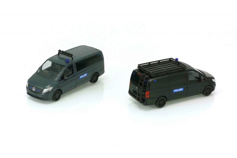 Aus Hamburg kommen neue Einsatzfahrzeuge der „Special Forces“. Nils Johannsen vom Polizeimodelle-Shop hat bei Busch Miniaturen zweier Mercedes Vito Tourer der Polizei-Spezialeinsatzkräfte in Auftrag gegeben. Wie bei seinen Sondermodellen üblich, unterscheiden sich die Modelle nicht nur in der Farbgebung, sondern auch in der Ausstattung mit Anbauteilen.