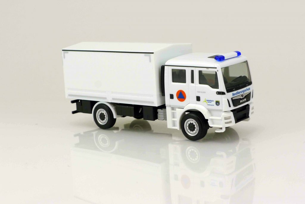 Das neue Fahrzeug für den Bevölkerungsschutz der Städteregion Aachen ist ein MAN TGM Mehrzweckkraftwagen (MzKW), der ganz in Weiß gehalten ist. Die Basis des Fahrzeugs bildet ein MAN TGM 13.250, der Aufbau mit einem Spriegel und einer Ladebordwand stammt vom Karosseriebauer Freytag. Der Bevölkerungsschutz umfasst sowohl den Katastrophenschutz wie auch den Zivilschutz. Darauf weist auch das Logo auf den Fahrerhausseiten hin, ein blaues Dreieck auf orangefarbenem Grund, das internationale Schutzzeichen des Zivilschutzes. Der MAN TGM MzKW bewältigt in idealer Weise die Aufgaben des Zivilschutzes, seine robuste Bauweise und der Allantrieb lassen ihn auch schwierige Geländeverhältnisse meistern.