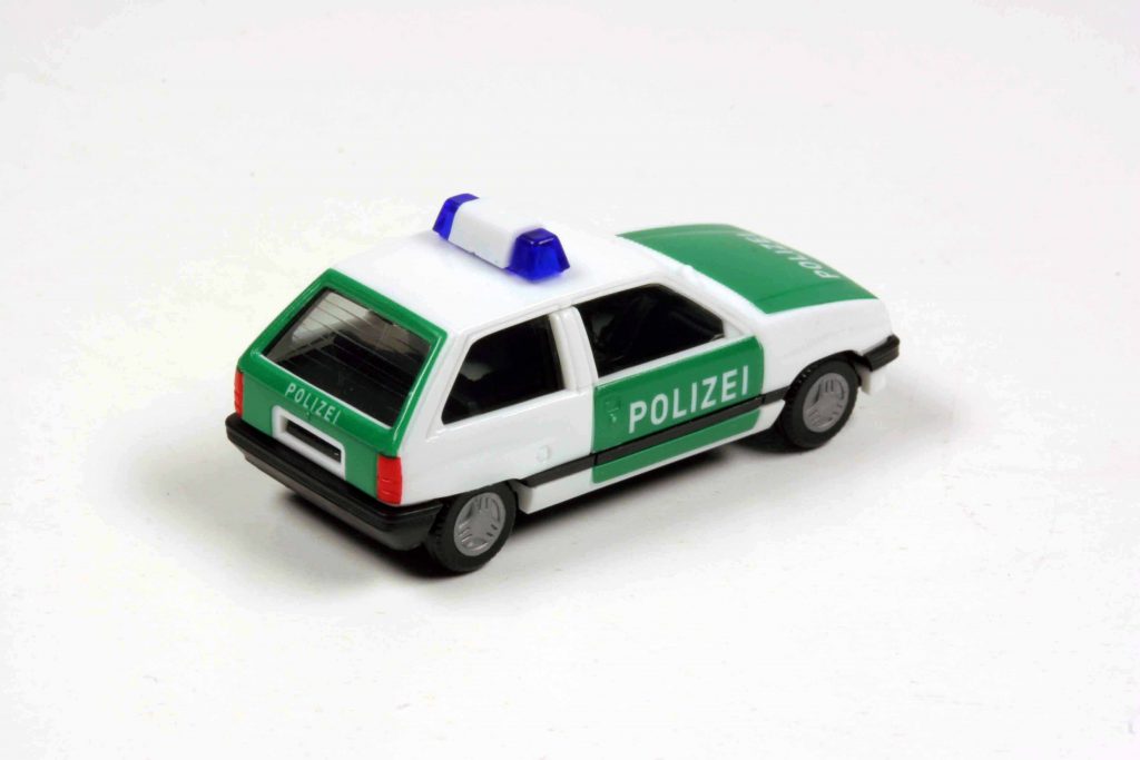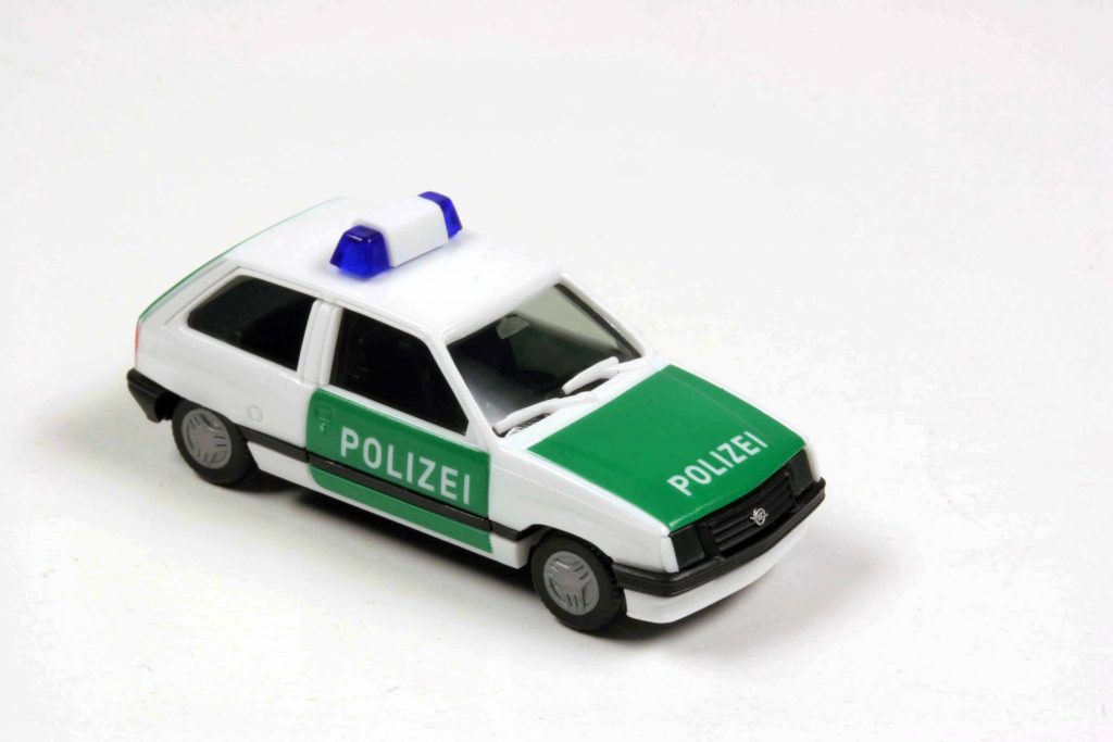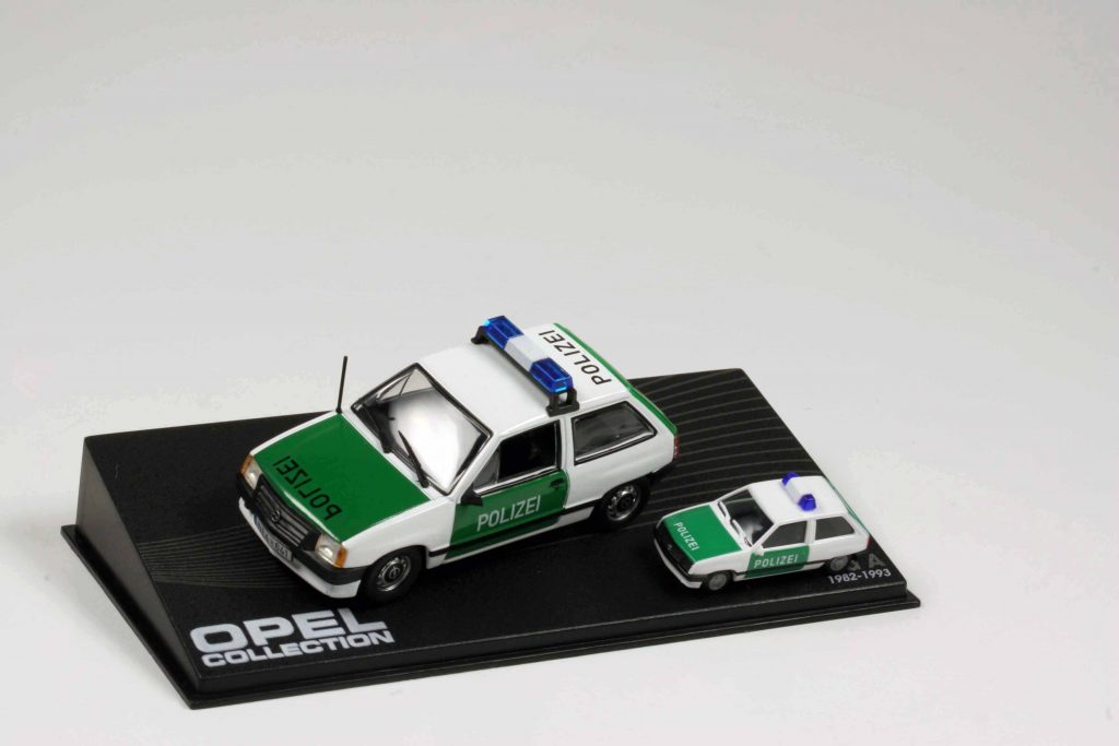 Das sollte aber so manche Modellverantwortliche nicht davon abhalten, den Halluzinationen phantasievoller Hersteller Glauben zu schenken. „Wenn Rietze einen Feuerwehr-Calibra machte“, so dachten sich die Macher der Kiosk-Serie Opel-Collection anno 2014, „dann wird es ihn schon gegeben haben“, und erteilten flugs Ixo den Auftrag, in 1:43 umzusetzen, was Rietze in 1:87 vorgegeben hatte. Noch offensiver gingen sie mit dem Polizei-Corsa um. Obgleich Ixo mehrere Corsa-Generationen im Programm hatte, votierte die Eaglemoss-Programmleitung für einen Corsa A als deutschen Polizeistreifenwagen. Es stimmt, dass es Corsas als Polizeiautos gab, keine Frage. Im Jahre 2009 stellte die Thüringer Polizei 161 Opel Corsa D, allesamt hergestellt in Eisenach, in Dienst. Trotz der räumlichen Nähe ging das nicht auf dem kleinen Dienstweg vonstatten. Opel hatte eine europaweite Ausschreibung gewonnen. Die neuen Wagen ersetzten bei der Thüringer Polizei eine Marge an Opel Corsa B, die 1999 in Dienst gestellt worden waren. Auch bei der Berliner Polizei war der Corsa mehrerer Generationen im Streifeneinsatz. Auf dem Land diente er den Kontaktbeamten, in der Stadt zur Überwachung gefährdeter Objekte durch den „Zentralen Objektschutz“. Die Landespolizei Brandenburg benutzte ebenfalls gerne den Corsa, besonders die Kontaktbeamten auf dem flachen Land. Aber eben nie den Corsa A. Sondern Corsas späterer Generationen. Den Corsa A hatten ausländische Polizeibehörden in Dienst. Aber nicht die deutsche Polizei.