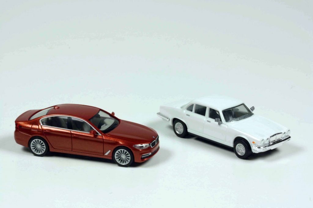 Herpa bringt in seinem Standardsortiment immer wieder neue Farben. Besonders beliebt ist der Jaguar XJ Serie III, dessen Ursprünge auch in den frühen 80er Jahren liegen. In Weiß mit neuen Felgen wird er nun temporärer Bestandteil des Herpa-Pkw-Sortiments. Jaguar bot das Vorbildfahrzeug von 1979 bis 1992 an, der Jaguar-Originalfarbton heißt Tudorwhite. Ebenfalls neu: Der Fünfer-BMW der Baureihe G30 von 2017 in Valenciaorangemetallic.