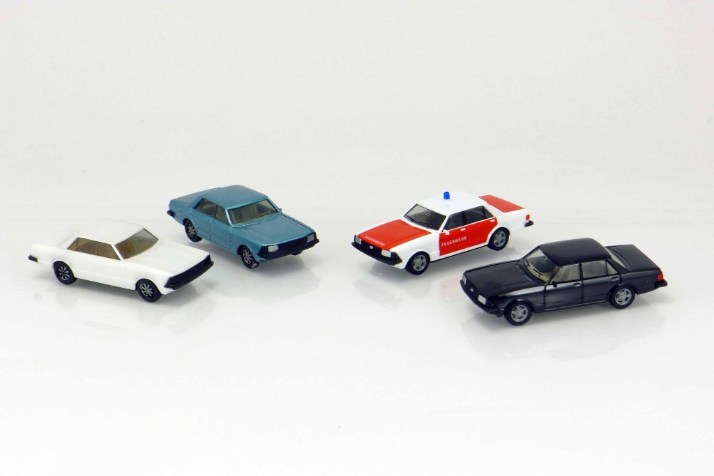 029025 Ford Granada 1977. Karosserie schwarz. IA hellgrau. UVP 9,95 €. 099004 dito „Feuerwehr“, weiß mit roten Kontrastflächen. IA schwarz. Ein blautransparentes Warnlicht. UVP 14,95 €.