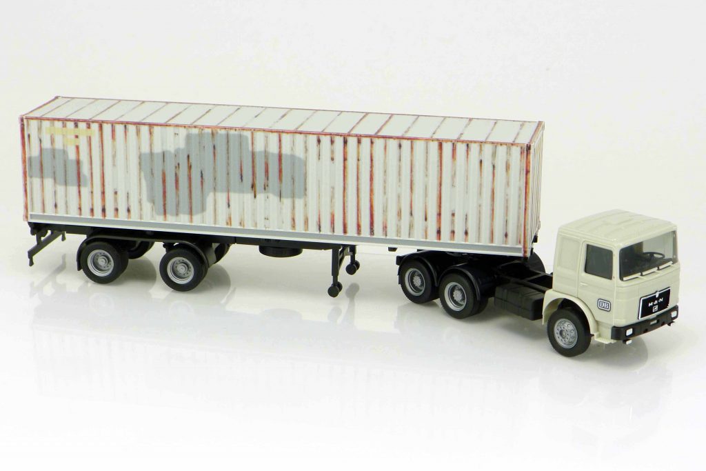 Auch im Lastwagen-Bereich gibt es ein Wiedersehen mit alten Bekannten, die auch heute noch in ihrer Gestaltung überzeugen können. Beim Iveco Eckhauber Hochbordkipper gefällt uns besonders die rote Kühlergrillumrandung. Die MAN F8-Zugmaschine (ein Lieblingsmodell des Verfassers) in der Farbgestaltung der damaligen Deutschen Bundesbahn zieht einen außer Dienst gesetzten 40-Fuß-Container, bei dem alle Beschriftungen übermalt wurden. Ob der Sattelzug auf dem Weg zum Schrottplatz ist?