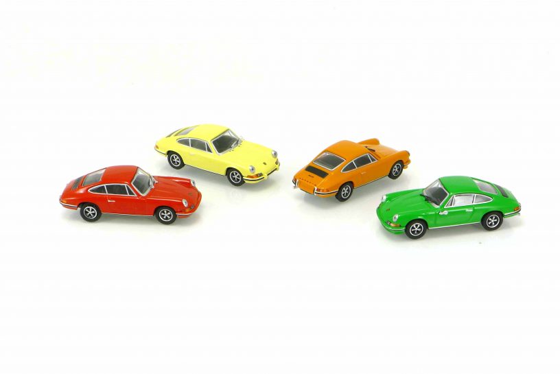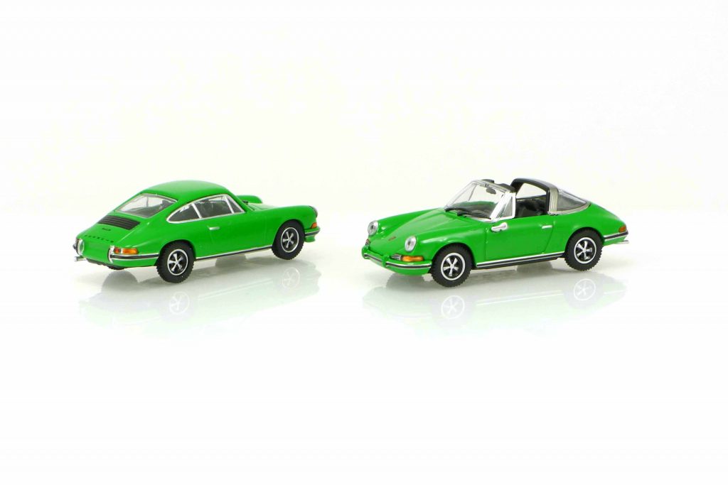 Porsche gehört zu Minichamps wie Spätzle zur schwäbischen Küche. So darf ein Modell des Porsche 911 der ersten Generation nicht im Angebot fehlen. Der Urahn aller Porsche 911 bis zum heutigen Tag erblickte im Jahr 1963 als Nachfolger des Porsche 356 das Licht der automobilen Welt. Den auf der IAA 1963 in Frankfurt am Main vorgestellten Sportwagen bezeichnete Porsche zunächst als 901, aber Peugeot hatte etwas dagegen, denn die dreistellige Bezeichnung mit der Null zwischen den beiden anderen Ziffern war bereits geschützt. So änderte Porsche den Namen des Fahrzeugs auf 911. Das war ein Glücksfall, vor allem international. Nine-Eleven klingt eingängig. Wie würde Nine-Zero-One klingen? Aber vielleicht hätten wir uns auch daran gewöhnt… Dem zunächst nur als Coupé erhältlichen 911 folgte 1967 die (halb-) offene Targa-Version mit breitem Überrollbügel. Das Coupé liefert Minichamps in den Vorbildversionen als 911 S (160 PS) und 911 T (110 PS). Auf den ersten Blick gleichen sich die Modelle, die Unterschiede liegen im Detail. Den Porsche 911 S gibt es mit zwei unterschiedlichen vorderen Stoßstangen, beim blassgelben mit, beim roten ohne Stoßstangenhörner (vor und nach 1972). Die Frontpartie ist anders gestaltet, beim 911 S mit, beim 911 T ohne Spoiler. Auch beim Targa-Modell erkennen wir diese kleinen, aber wichtigen Unterschiede in der Frontgestaltung. Bei den Targa-Modellen mit Lippe am Frontspoiler hat Minichamps sogar die Aussparung für die Abschleppöse nachgebildet. Alle acht Miniatursportwagen rollen auf den klassischen Fuchs-Felgen, die Motorgitter sind entweder mit Chromleisten oder ganz in Schwarz dargestellt. Zu guter Letzt noch eine Besonderheit: Das Oktett der Porsche 911-Modelle zeichnet eine Besonderheit des Modelljahrs 1972 nach, denn diese besaßen einen Öleinfülldeckel hinter der Beifahrertür unterhalb der hinteren Seitenscheibe. Die als „Ölklappenmodelle“ bezeichneten Fahrzeuge wurden allerdings nur von September bis August 1972 in ungefähr 10.000 Exemplaren über alle Bauarten hinweg produziert. Denn dieses Feature, als Erleichterung beim Nachfüllen von Öl gedacht, erwies sich als problematisch, mancher Fahrer oder Tankwart verwechselte die Ölklappe mit der Einfüllöffnung für den Kraftstoff – Motorschäden waren die Folge. Schön, dass Minichamps auch solche unscheinbaren Details beachtet. Nicht nur Porsche-Sammler, auch jeder Modellautofreund wird die neuen Modelle in seiner Sammlung willkommen heißen.