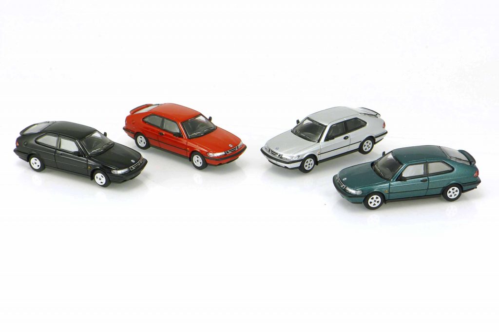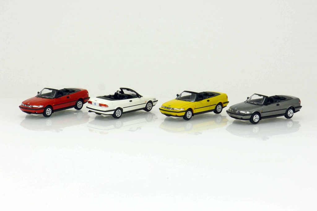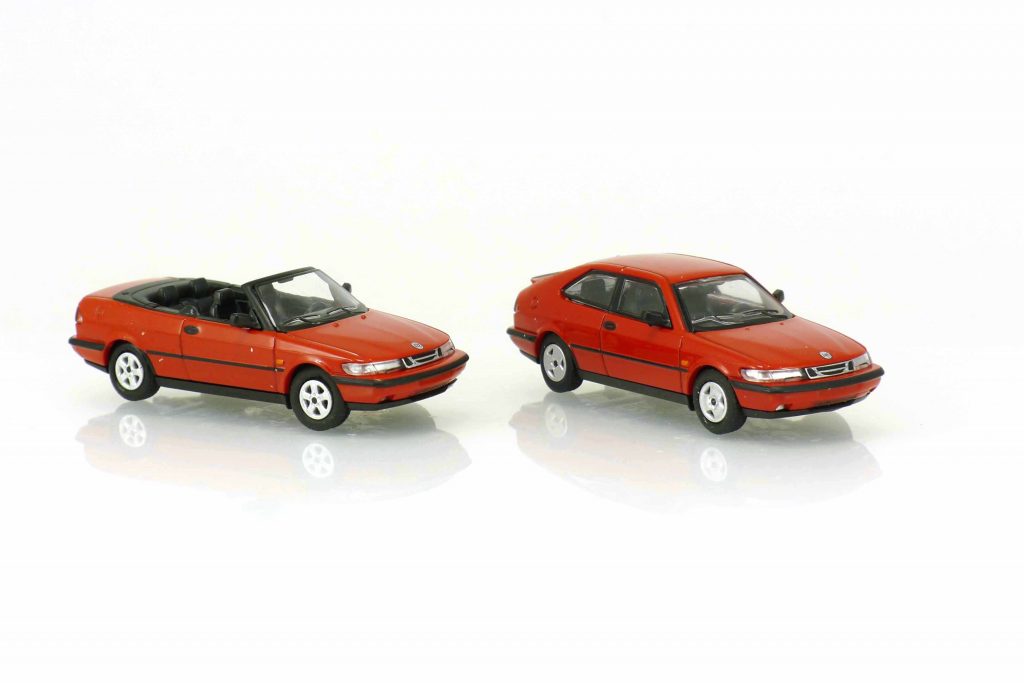 Minichamps hält die Erinnerung an die schwedische Automobilmarke Saab mit zwei neuen Pkw-Modellen wach. Die Vorlage dafür liefert der Saab 900 der zweiten Generation, zum einen als zweitüriges Coupé, zum anderen als Cabriolet. Wie gewohnt liefern die Aachener Modellbauer die beiden Karosserievarianten in jeweils vier Farben und mit zwei unterschiedlichen Felgentypen. Dass die Umsetzung der Linienführung in den Maßstab 1:87 hervorragend gelungen ist, muss bei Minichamps eigentlich nicht mehr besonders erwähnt werden. Im Juli 1993 präsentierte Saab die zweite Generation des Saab 900 auf dem Marktplatz in Trollhättan, zunächst nur als viertürige Schräghecklimousine. Zu diesem Zeitpunkt gehörte Saab bereits zum General-Motors-Konzern, deshalb fanden auch viele Komponenten von anderen GM-Fahrzeugmodellen Verwendung. Vor allem Opel-Automobile steuerten wesentliche Baugruppen teil. So stammen Teile des Chassis und der Bremsanlage vom Opel Vectra A und Calibra, die Hinterachse vom Astra. Bald ergänzte Saab das Angebot um einen Zeitürer, der als Coupé bezeichnet wurde. Im Sommer 1994 kam dann zur Jahreszeit passend noch ein Cabriolet auf den Markt. Von der ersten Generation des Saab 900 wurden mehr als 900.000 Fahrzeuge verkauft; besonderes Interesse fand er bei Kunden, die Wert auf eigenständige Technik, Sicherheit und schnörkelloses Design legten. Dagegen konnte Saab von 900 II nur etwas über 270.000 Exemplare absetzen. Diese trotz guter Testergebnisse geringe Marktakzeptanz rührte vermutlich durch die kritische Einstellung der Saab-Szene zum „General Motors“-Automobil her. Allerdings entwickelte sich der Saab 900 II seit einigen Jahren zum begehrten Youngtimer.
