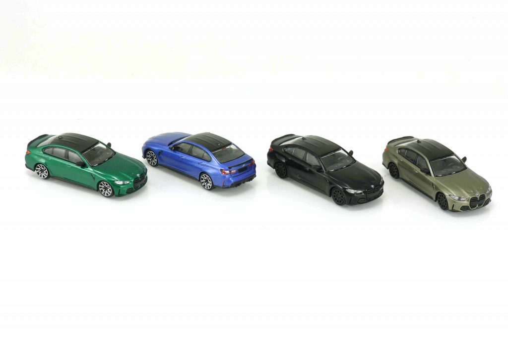 870023200 BMW M3 (G80) Limousine 2020. Karosserie grünmetallic mit Dach in Carbon-Optik. IA schwarz. 870023201 dito blaumetallic. 870023202 dito schwarzmetallic. 870023204 dito graumetallic.