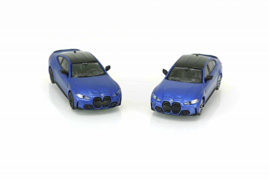 Man mag sie oder man mag sie nicht. Der Verfasser mag sie nicht, die „Botox“-Niere, die BMW mit der Vorstellung de BMW 4er-Reihe im Jahr 2020 präsentierte und die wegen ihrer wuchtigen Optik zu zahlreichen Diskussionen führte. Der G82, so die BMW-Baureihenbezeichnung, stellt ein Sportcoupé auf der Basis des G22 dar, das deutlich höher motorisiert ist und mit dem Basisfahrzeug nur Türen und Heckklappe gemein hat. Es besitzt zudem ein Dach aus Carbon, das Minichamps bei der Verkleinerung des Vorbilds natürlich auch perfekt nachgebildet hat, ebenso wie den voluminösen Kühlergrill. Dieser „ziert“ ebenso das zweite BMW-Modell von Minichamps, die BMW M3 (G80) Limousine des gleichen Baujahrs wie der M4. Die Modelle des BMW M3 und M4 werden nicht nur in vier Farbvarianten, sondern ebenfalls mit zwei verschiedenen Felgen-Typen ausgeliefert. Minichamps kann nicht nur Porsche, sondern auch BMW (und natürlich Saab).