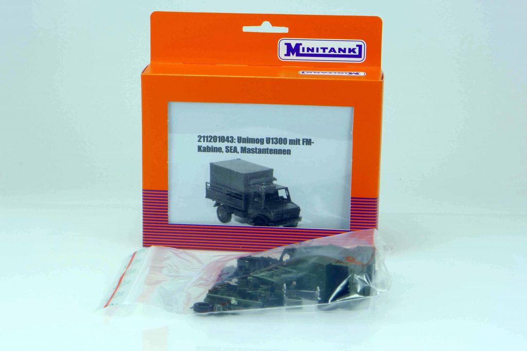 Neu im Sortiment der Minitank-Bausätze ist ein Unimog U 1300 L mit Fernmeldekabine. Zusätzlich kann das Modell mit einem SEA- Vorbaustromaggregat und Mastantennen nach eigenen Vorstellungen ausgerüstet werden. Alle Teile sind passgenau ausgeführt, eine Bauanleitung für das Basisfahrzeug liegt bei. Der Unimog U 1300 L wurde von 1975 bis 1993 gebaut und erfuhr in dieser Zeit einige Veränderungen. Das Fahrzeug wurde vor allem an die Bundeswehr und Feuerwehren mit Sonderaufbauten geliefert. Aber auch in der Forstwirtschaft oder bei kommunalen Bauhöfen war er im Einsatz. Angetrieben wurde er von einem Sechszylinder-Motor mit einer Leistung zwischen 131 und 169 PS. Das Vorbild des Minitank-Modells stand bei einem Fernmeldebatallion der Bundeswehr im Dienst.