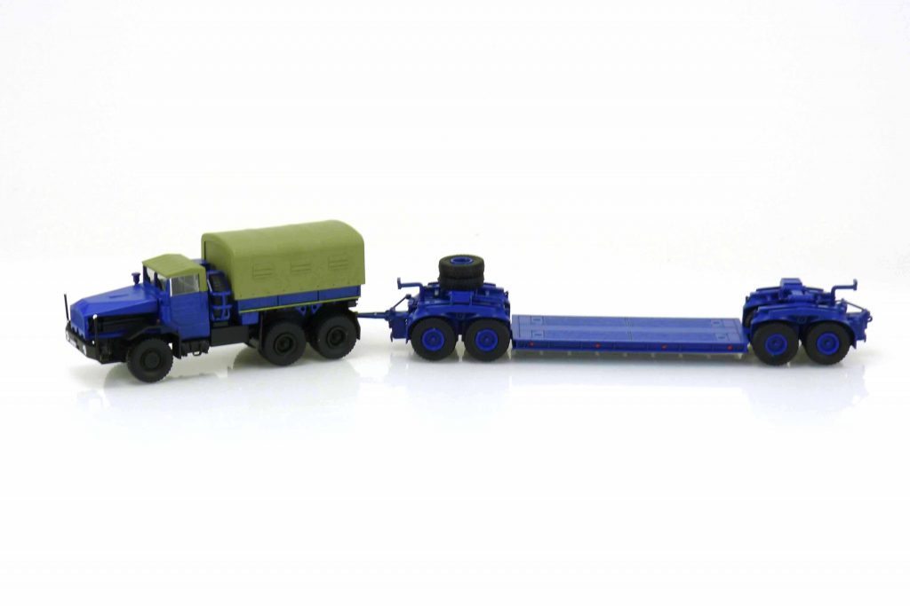 AAA-Collect 2MFAUNKBL Faun L 912/45A mit Kässbohrer-Tiefladeanhänger 1958. Zm und Anhänger THW-Blau. Beiliegende Seitenspiegel und weitere Zurüstteile. Handarbeitsmodell aus Kunststoff. UVP 59,00 €.