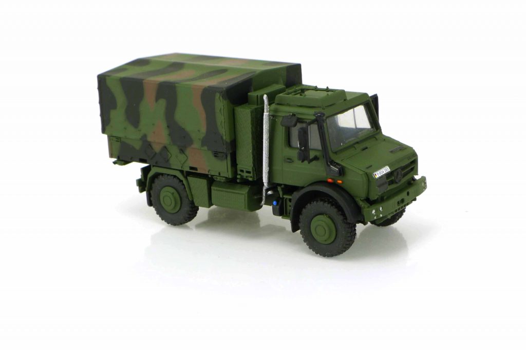 Auch die Bundeswehr setzt den Unimog U 5023 ein, ein hochgeländegängiges Fahrzeug. Dabei verwendet sie den Unimog U 5023 oft als Wechselbrückenfahrzeug. Es können neben einer Wechselpritsche auch ISO-Container, eine Fernmeldekabine oder eine Gerätepalette aufgeladen werden. Ausgerüstet ist der Unimog mit einem Euro-6-Motor mit 231 PS, mit dem 89 km/h erreicht werden können. Bemerkenswert sind die kleinen Scheinwerfer in der Stoßstange. AAA-Collect hat ein perfektes Modell auf die vier Räder gestellt, hauchdünn lackiert und vorbildgerecht bedruckt. Besonders die Tarnlackierung ist bestens gelungen.