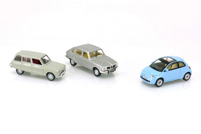 Norev 153525 Citroën Ami 6 Break 1969 grau. IA rot. Kennzeichen „352 00 19“. Metall. 511692 Renault 16 1965 silbermetallic. IA beige. Kennzeichen „816 HH 88“. 770064 Fiat 500 2008 hellblau. IA beige. Kennzeichen „AT 500 FI“. Kunststoff. UVP jeweils 9,90 €.